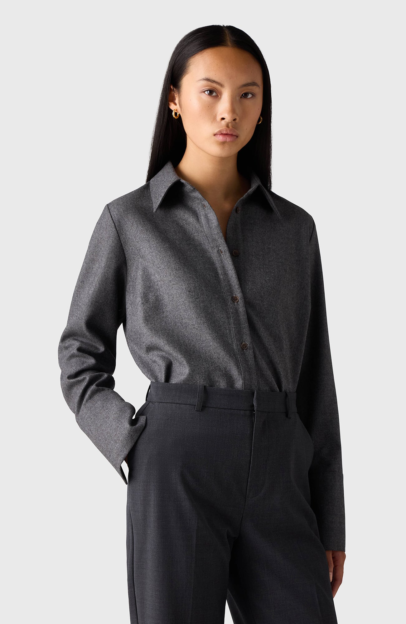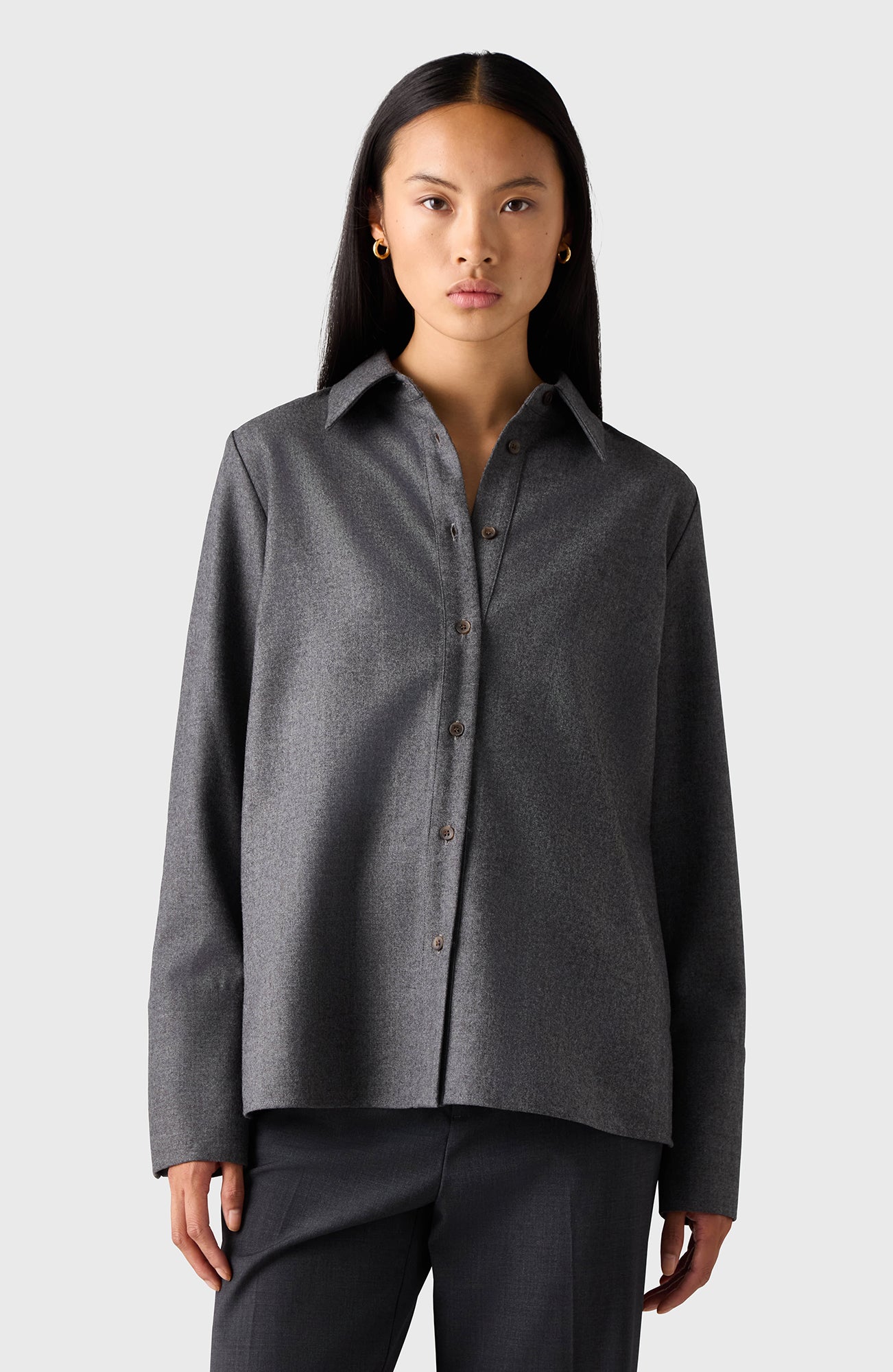 The Oprah Shirt is crafted from 100% wool and features horn buttons. It has a wider, relaxed fit and is longer at the back.