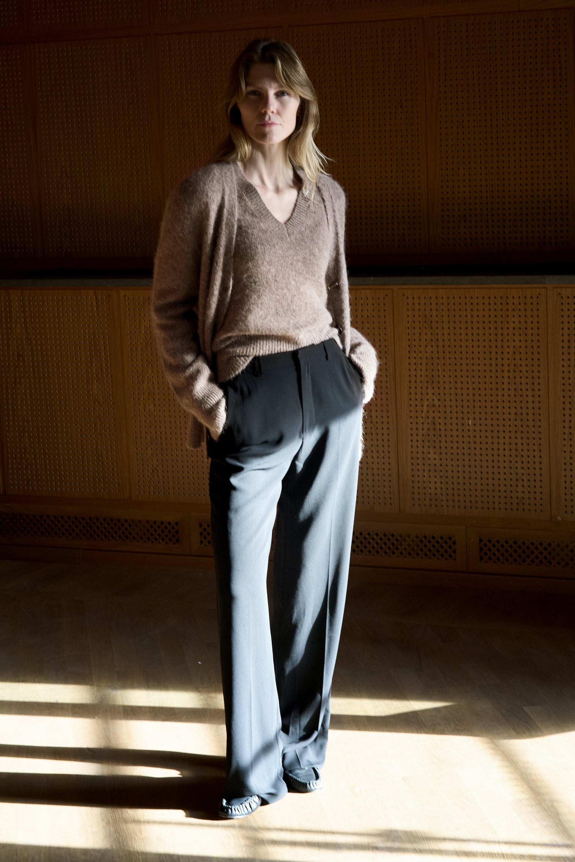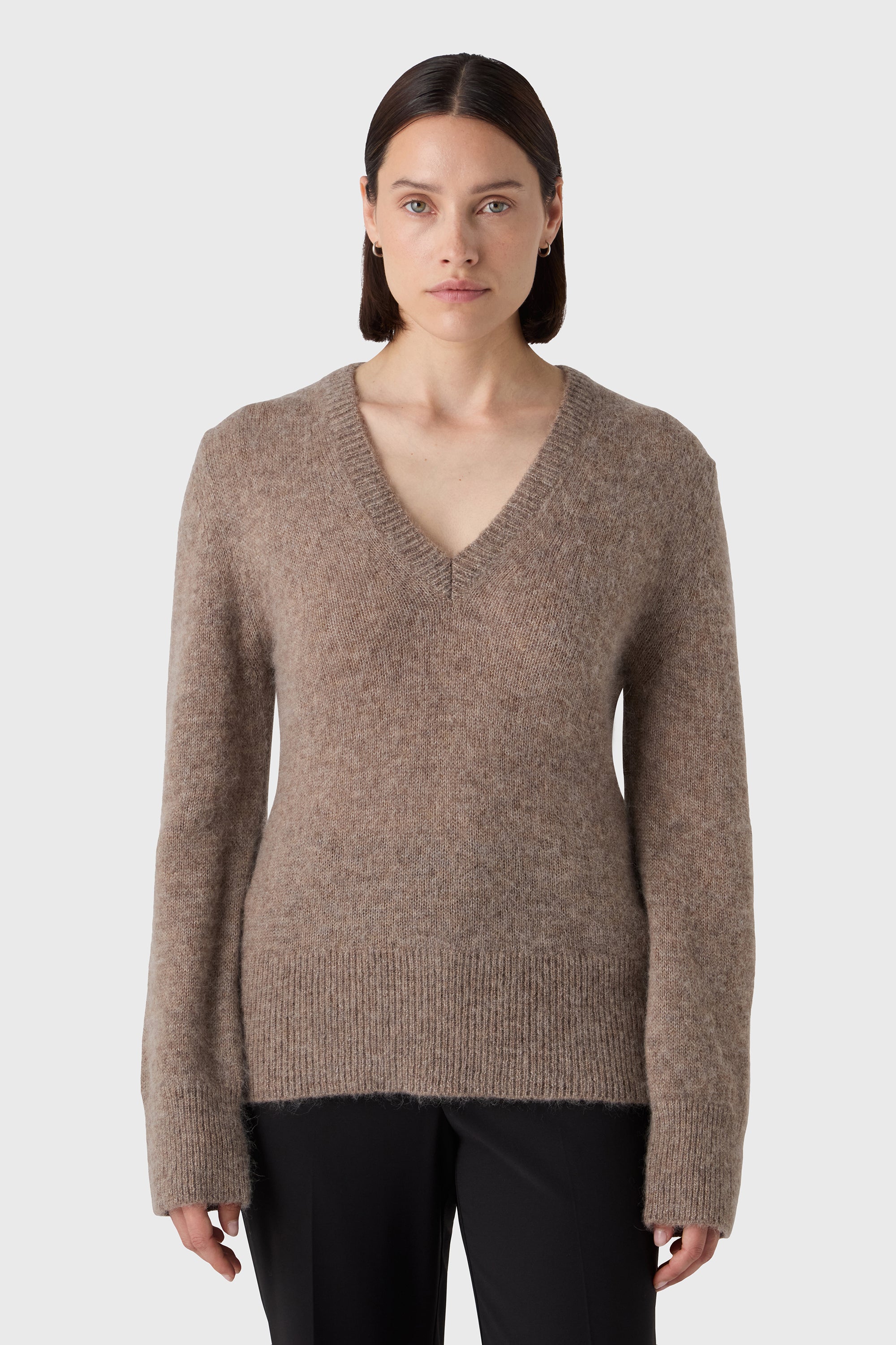 Soft structure, subtle volume. The Giulia Alpaca Jumper is knitted from supersoft alpaca yarn with a lightly brushed texture, dropped shoulders and a flattering V neckline. A warm yet airy favourite — perfect for layering or wearing on its own.