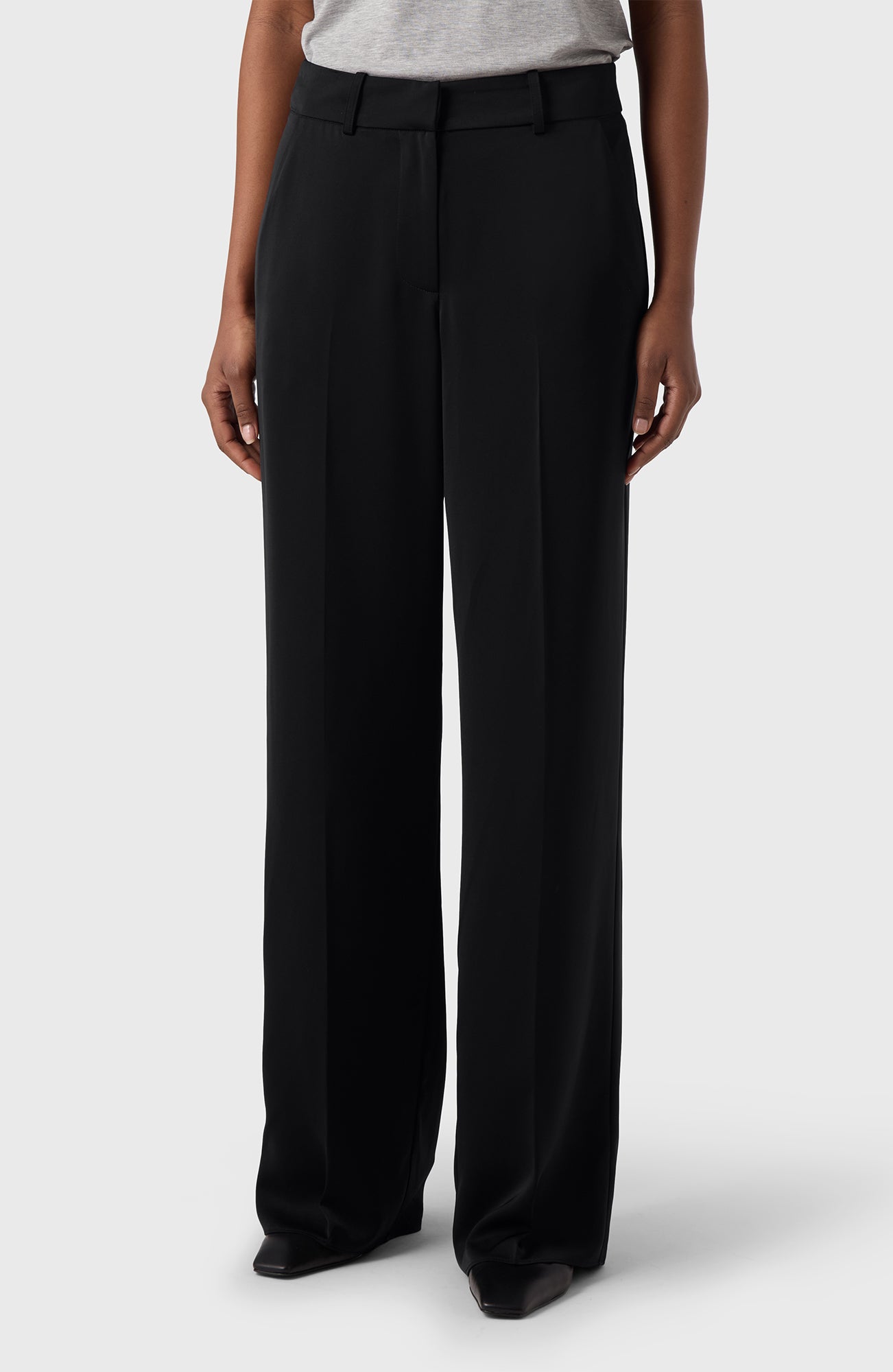 Tailored ease in a satin finish. The Ingrid Trousers are cut with a wide leg, mid-rise waist and front zip for a sleek silhouette. Soft satin stretch adds fluidity to every step — effortless to dress up or down.