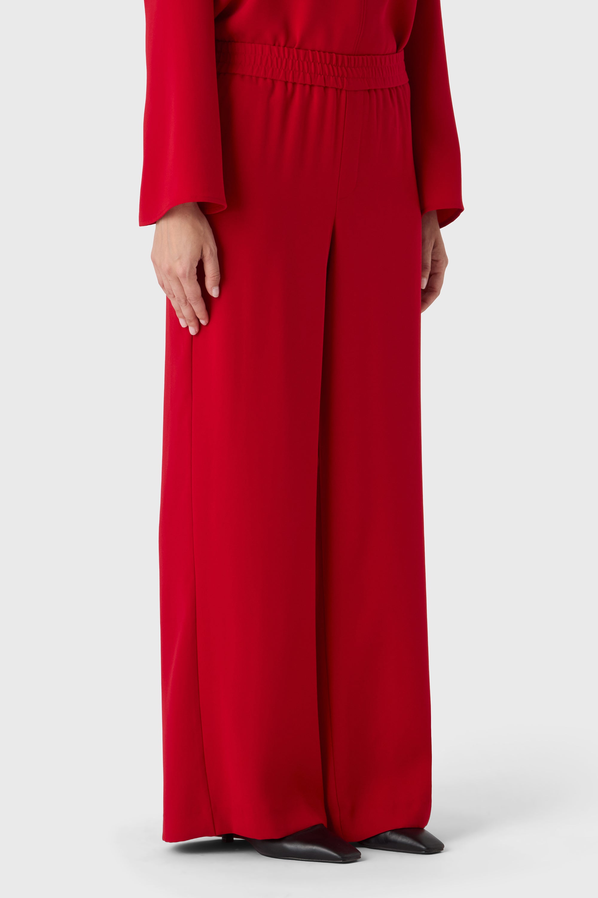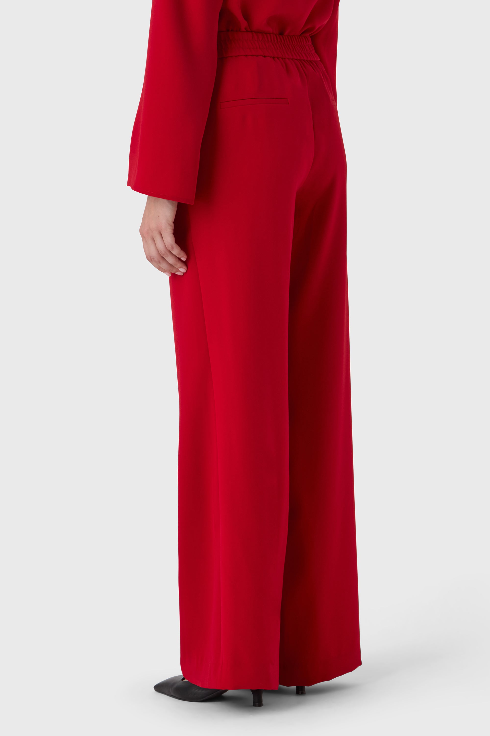 Soft volume, effortless feel. The Josephine Trousers are tailored in flowy poly twill with a wide leg and elastic waistband for all-day ease. The drape is fluid and flattering — ideal with a soft blouse or sleek knit.