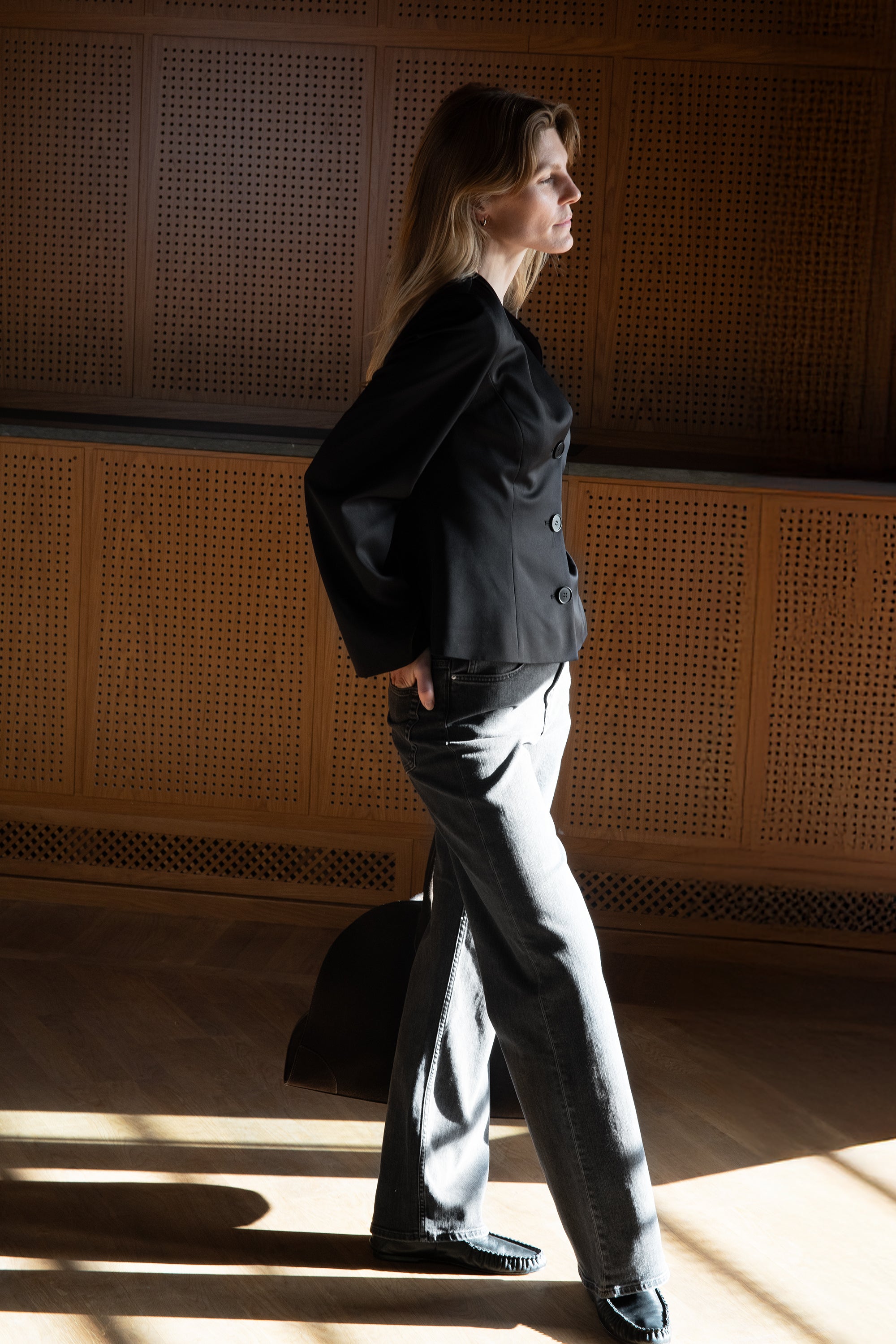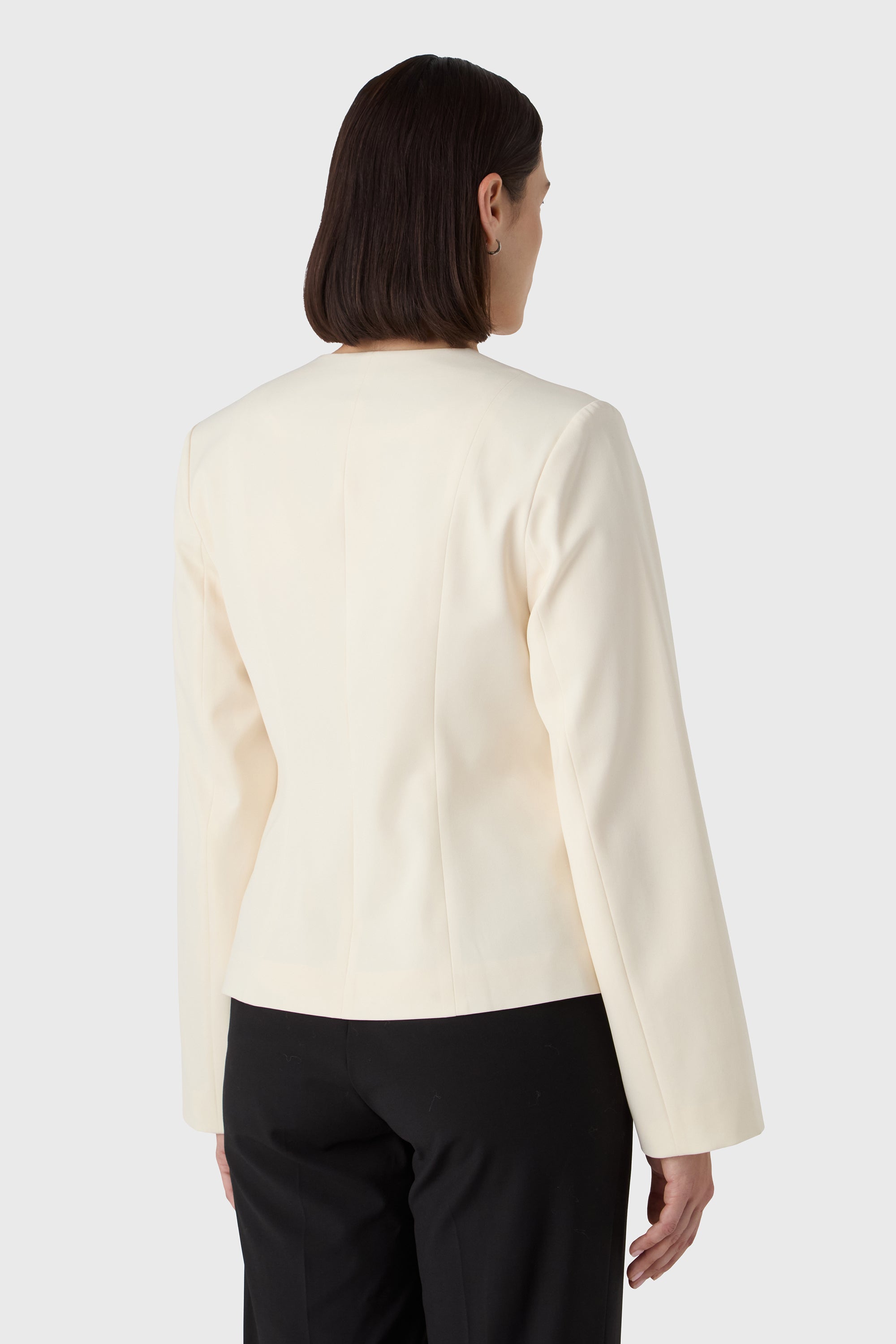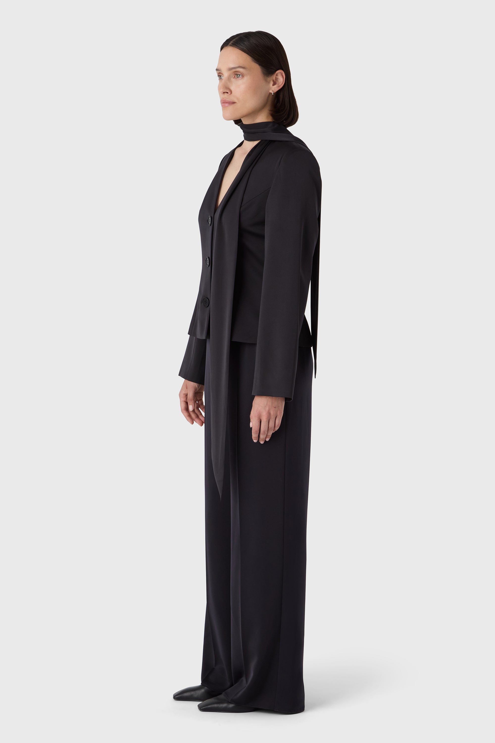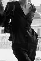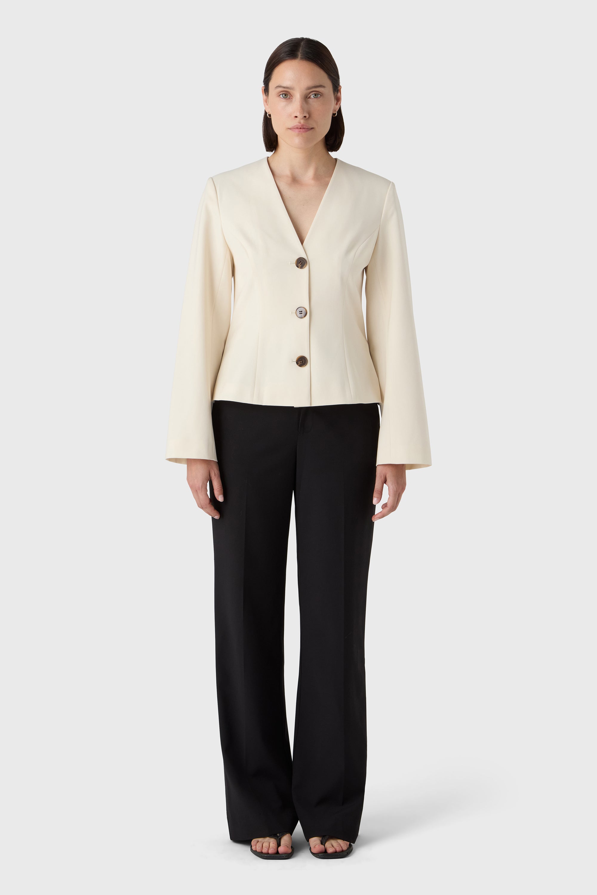 A sharp essential with soft edges. The Li Blazer features a clean V neckline, sculpted waist and long sleeves for a modern, feminine silhouette. The buttons add a quiet detail to the minimal tailoring — perfect with matching trousers or styled solo for a statement.