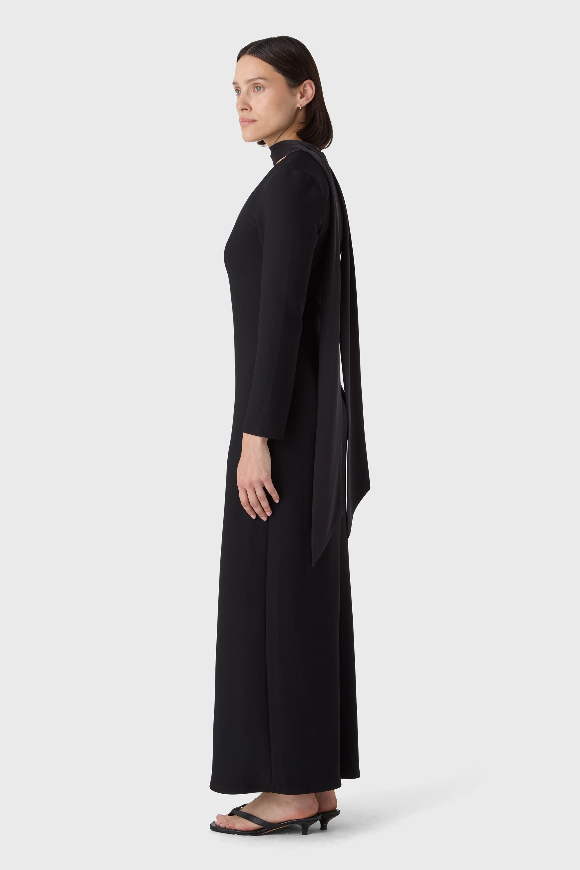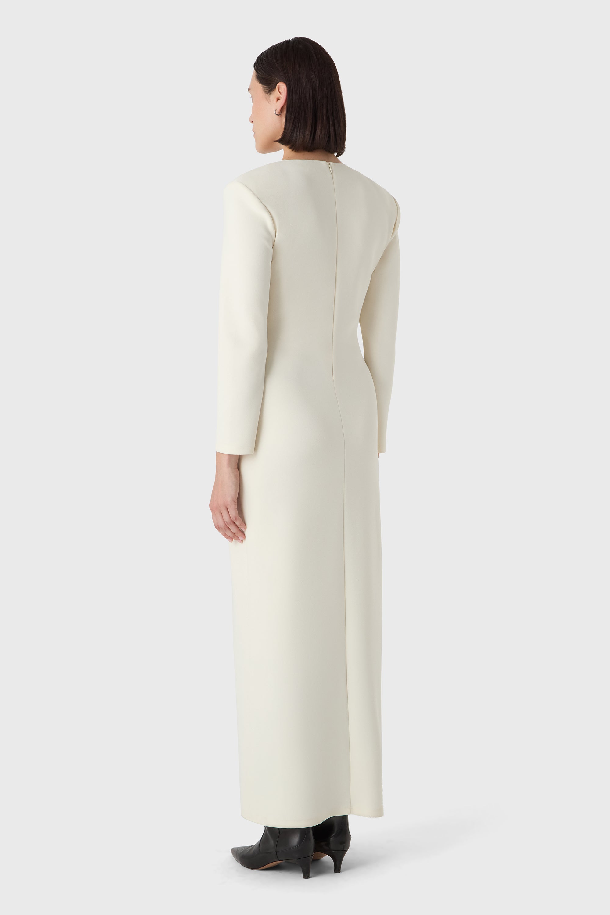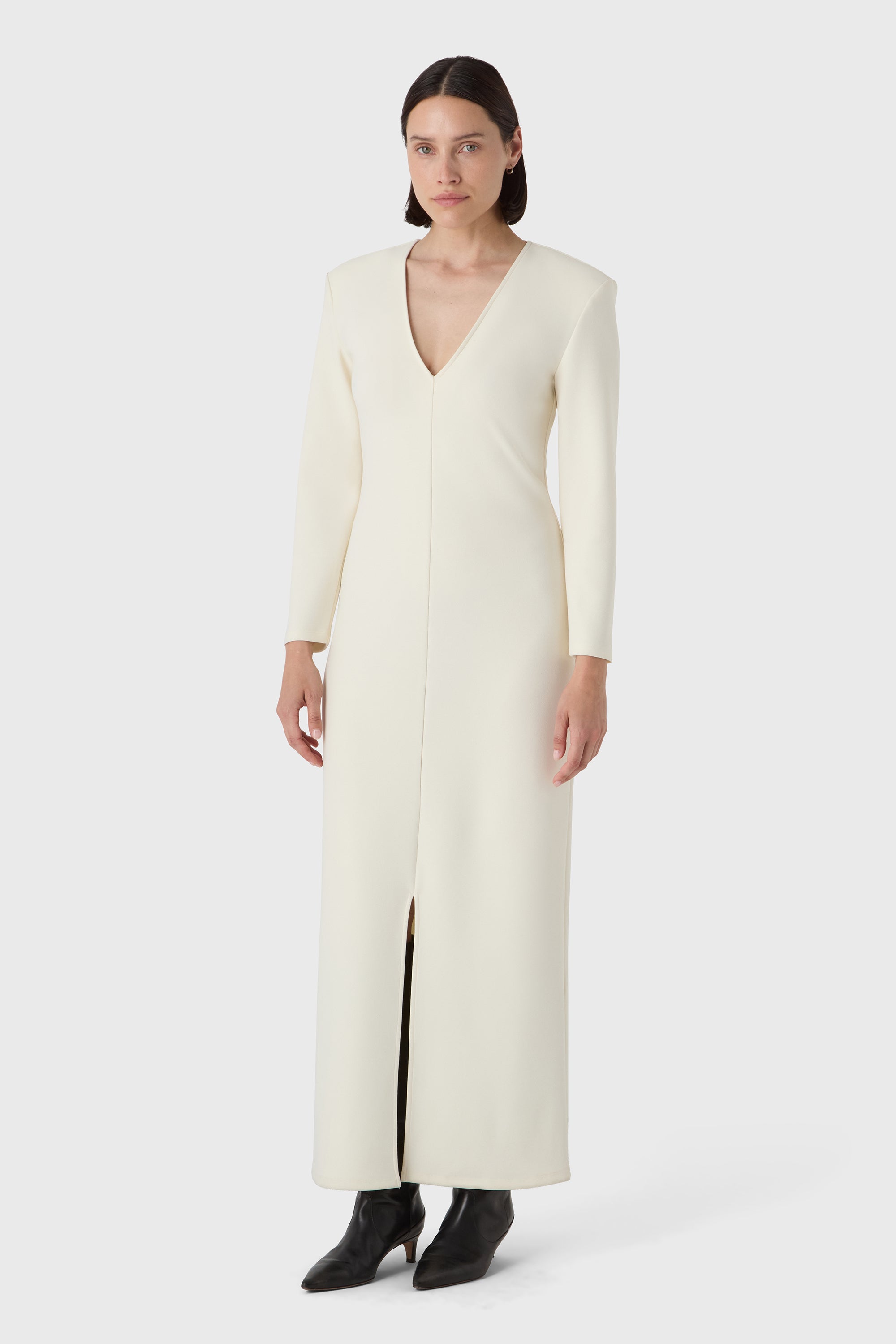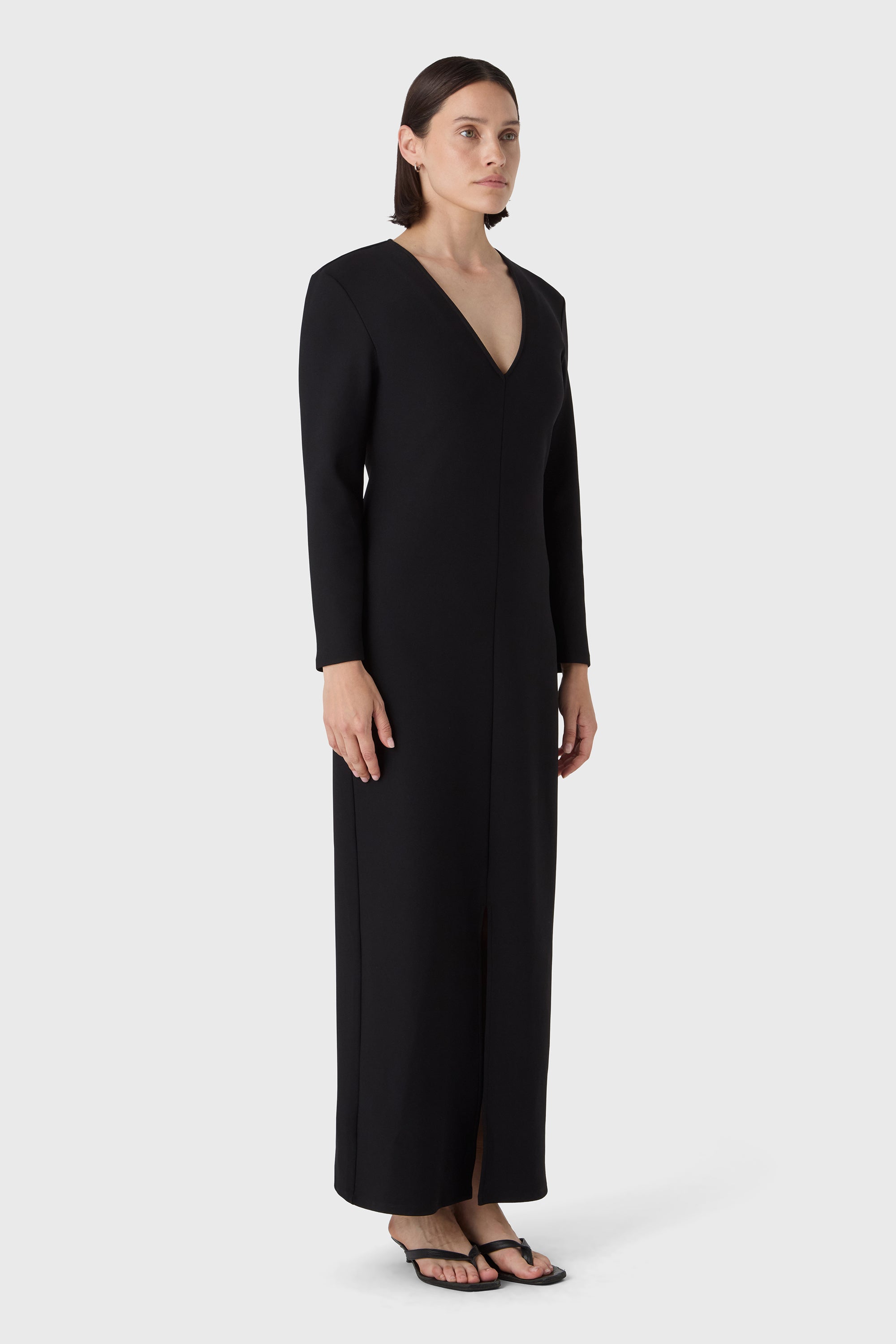 Bold and minimal. The Valerie Dress is made from sculpting superstretch jersey crepe with a deep V neckline, long sleeves and defined shoulders. A clean silhouette that makes a quiet statement — elegant from every angle.