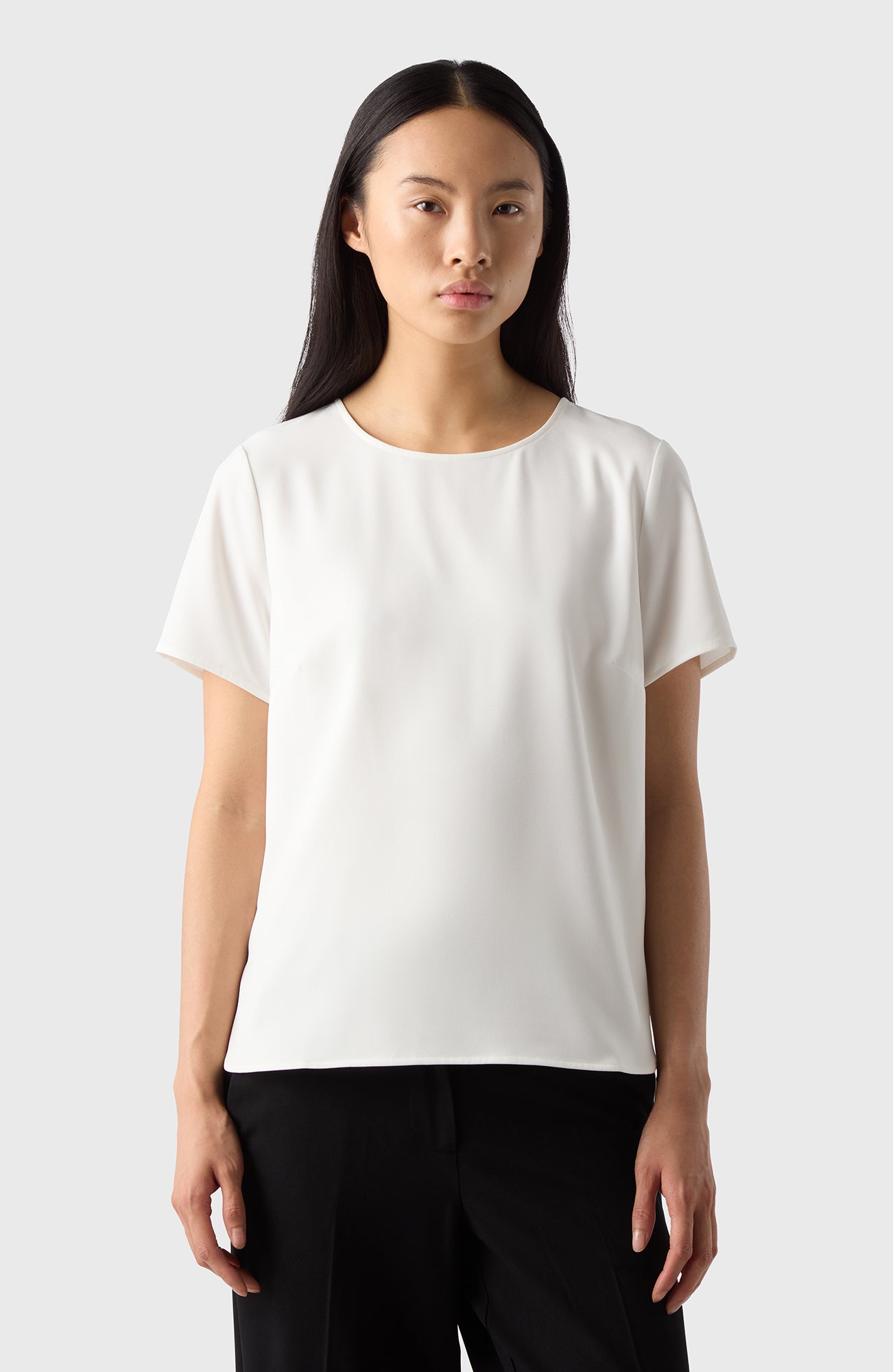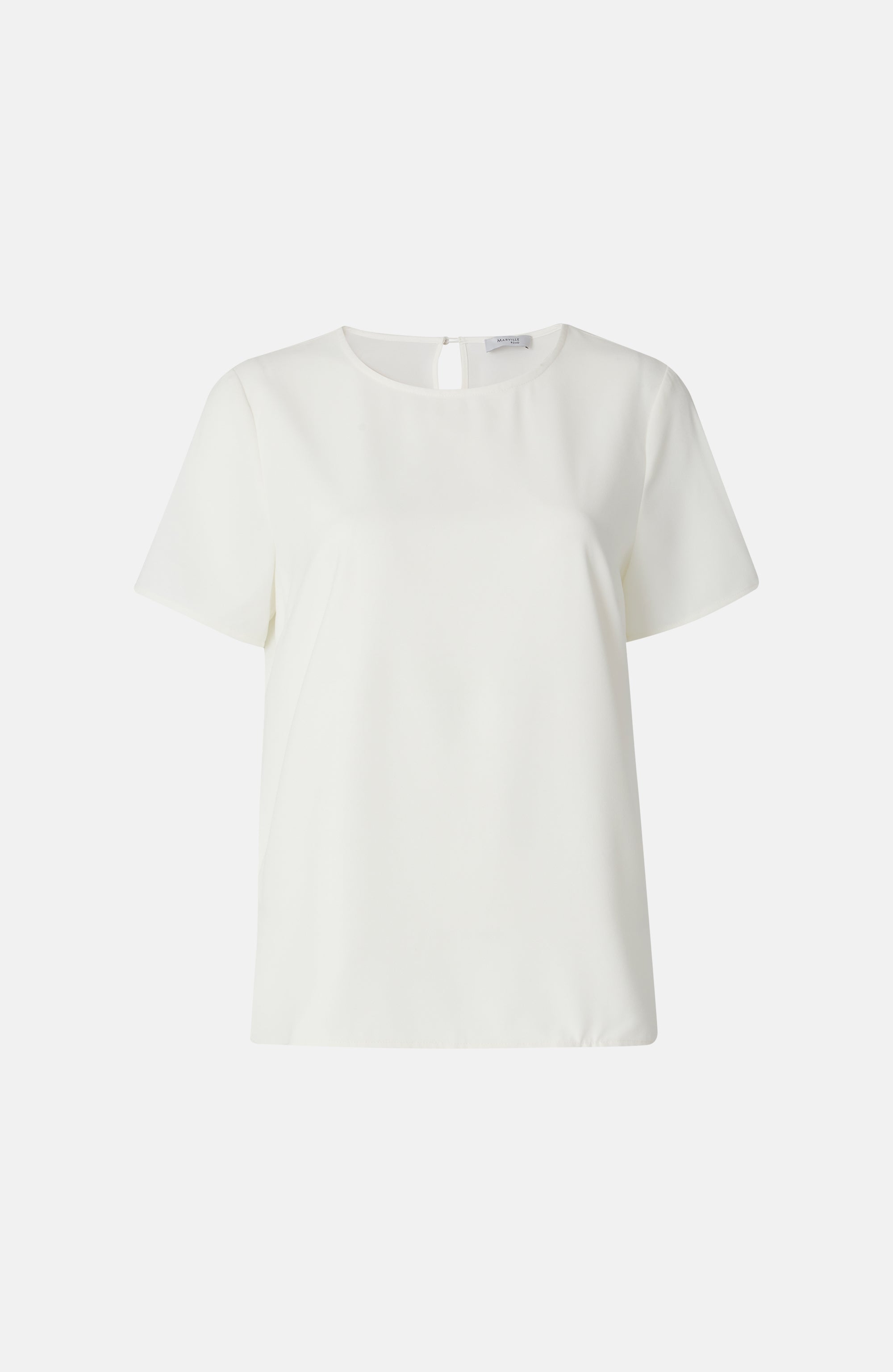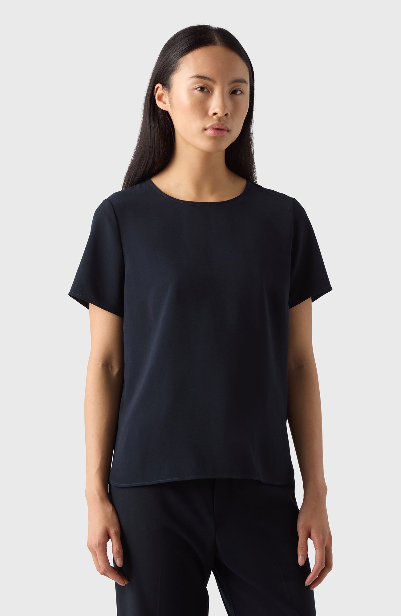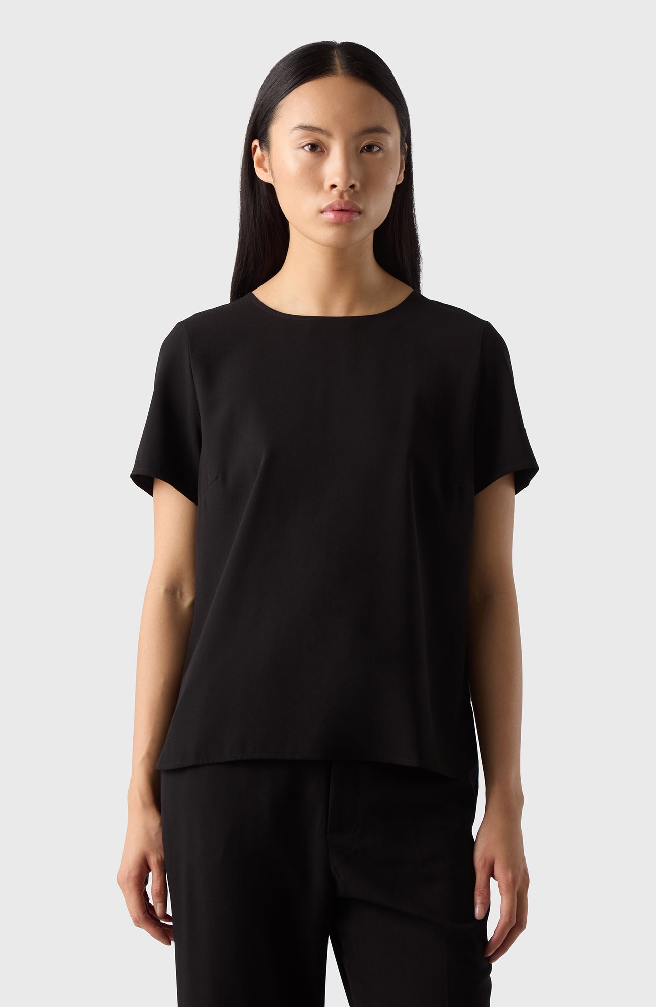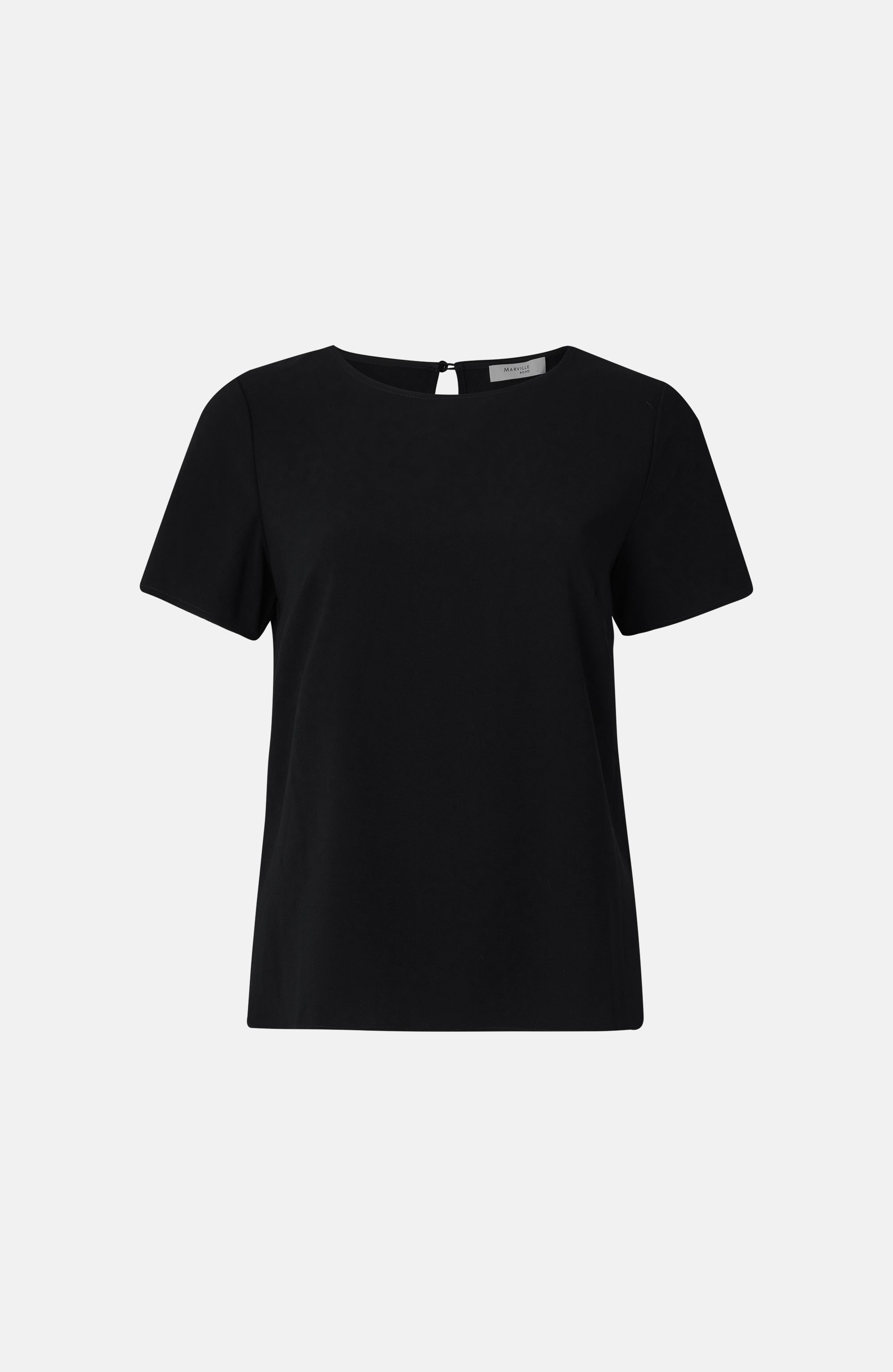 Olga top could be described as a “blouse tee” – she is more elegant than a basic T-shirt but more simple than a classic blouse. Basic yet sleek, she will add that little extra to your everyday look. Olga is designed for a slightly loose fit and has a round neckline that closes with a fabric-covered button.