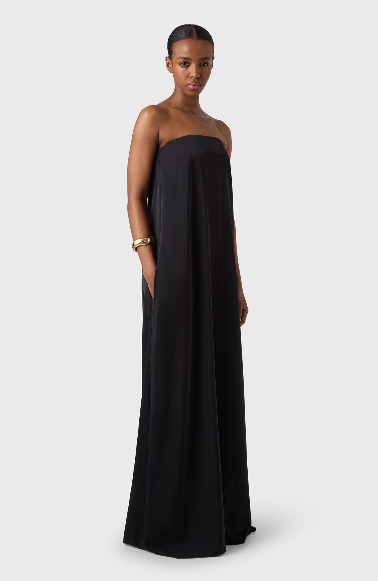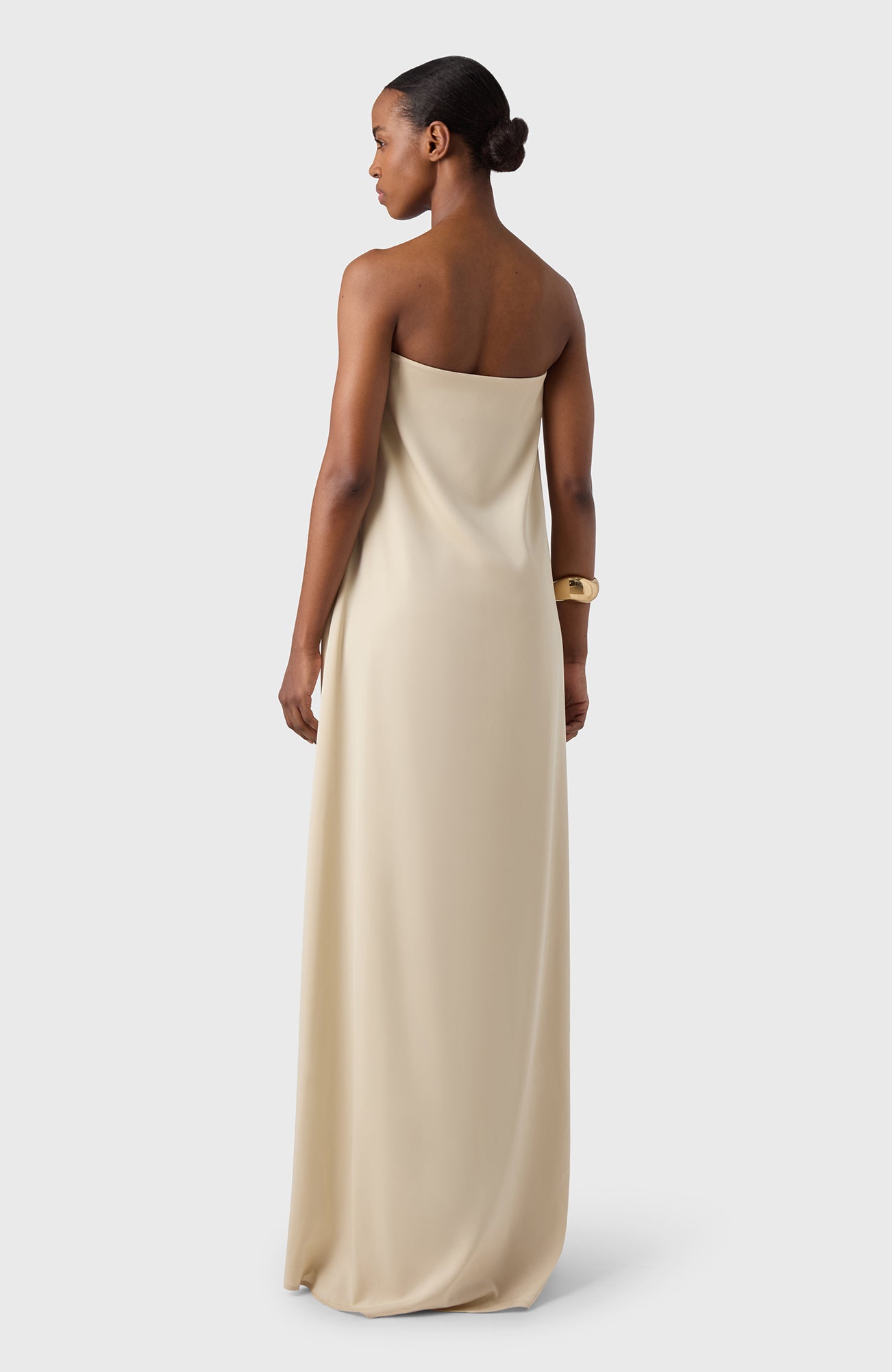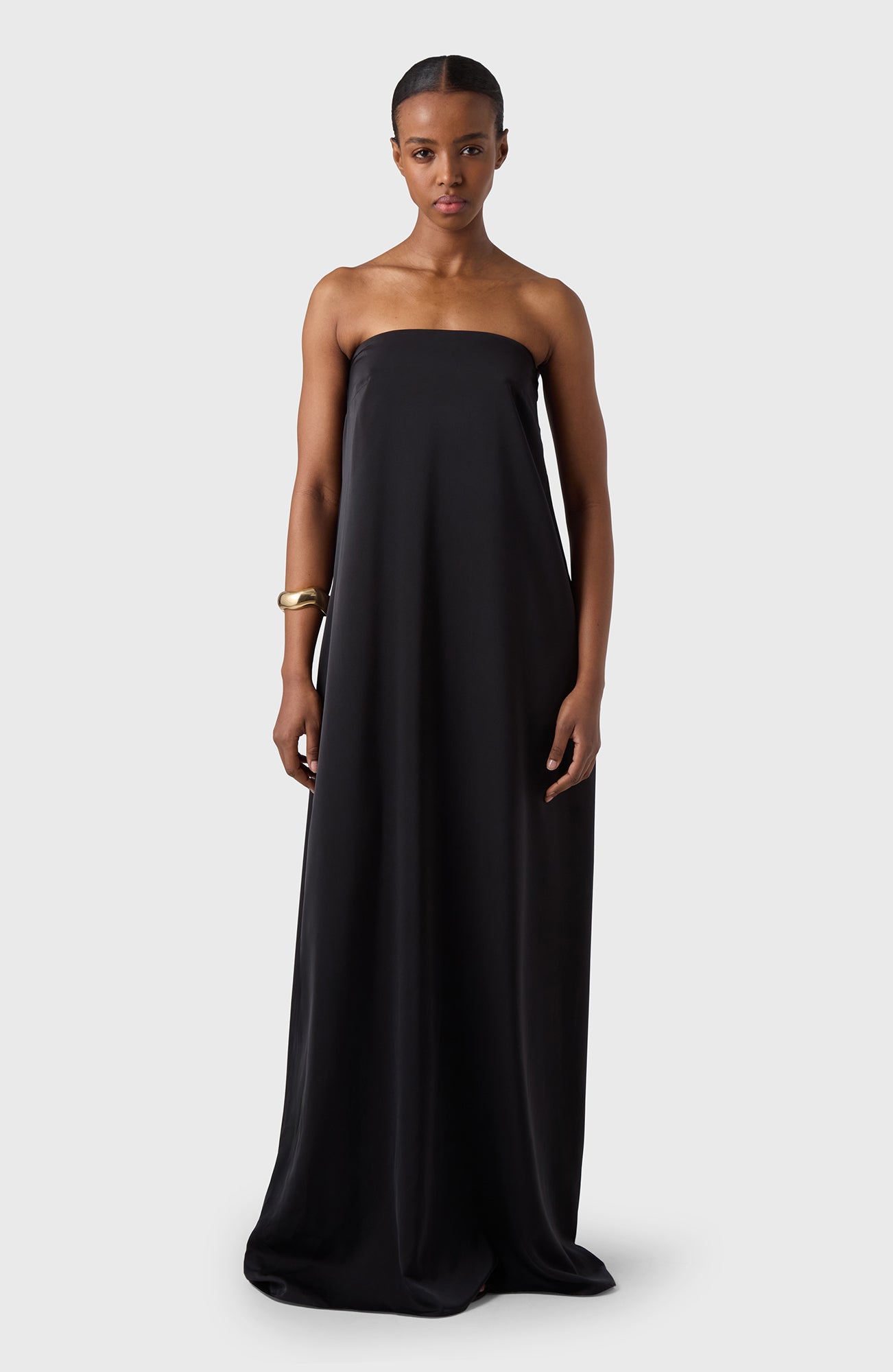 Sleeveless long Tube dress in our lovely satin stretch fabric. To wear on a warm summer days with flipflops or at a summer party with sandals.