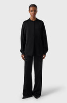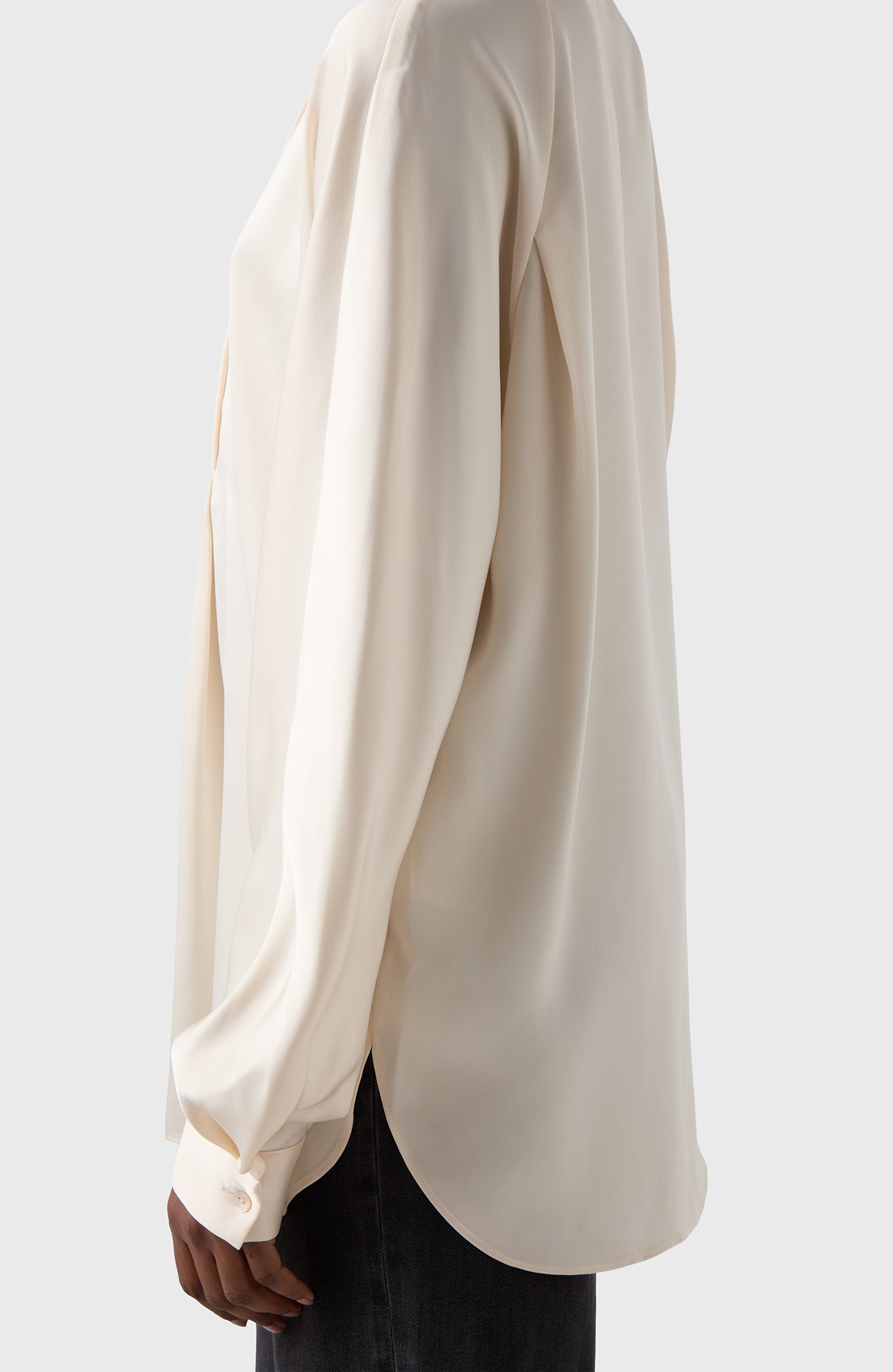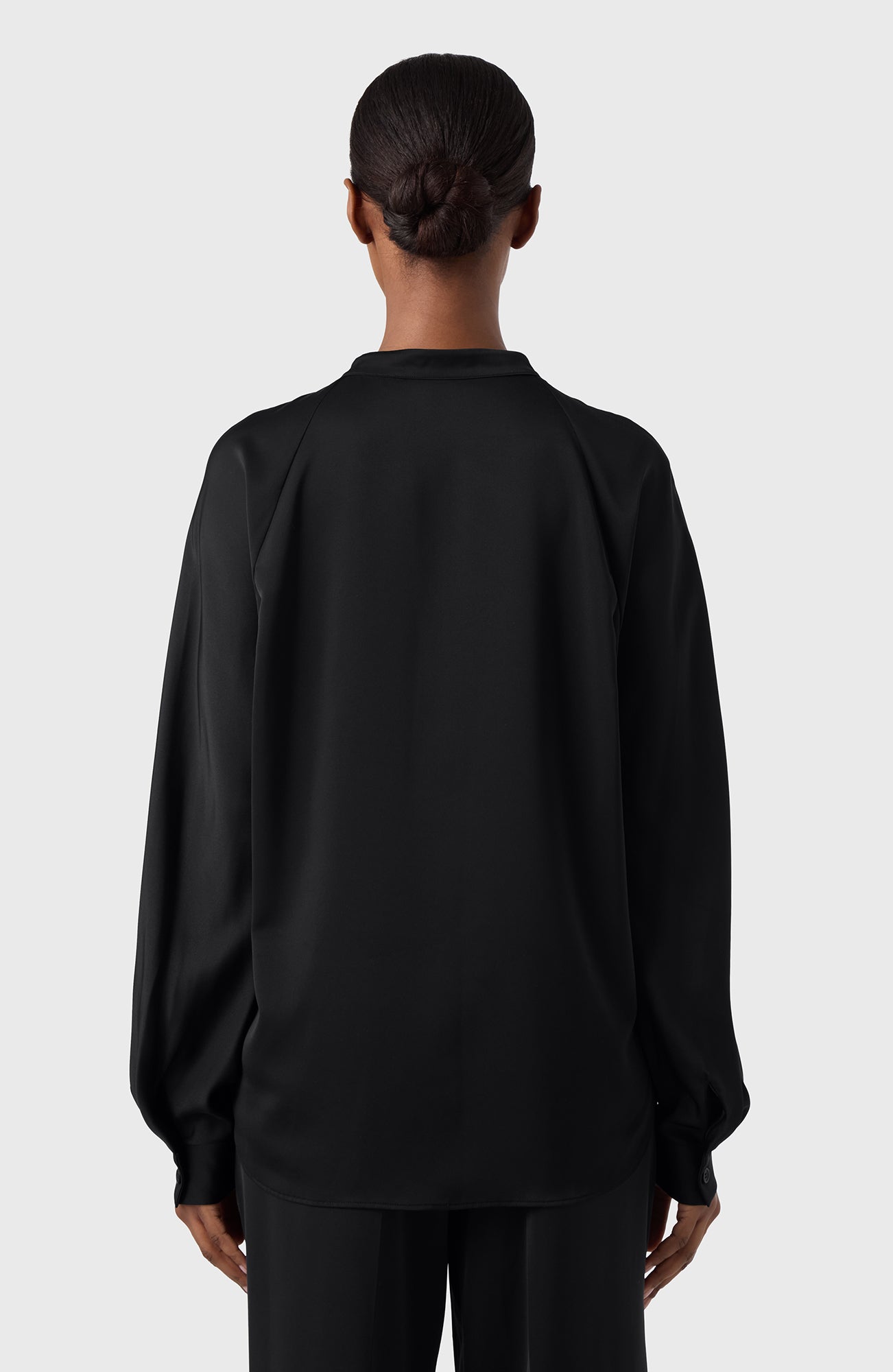 Long-sleeved blouse in soft satin stretch, featuring a round neckline, mother-of-pearl buttons, and gently rounded side hems. Designed with a feminine silhouette that flatters and feels effortless.