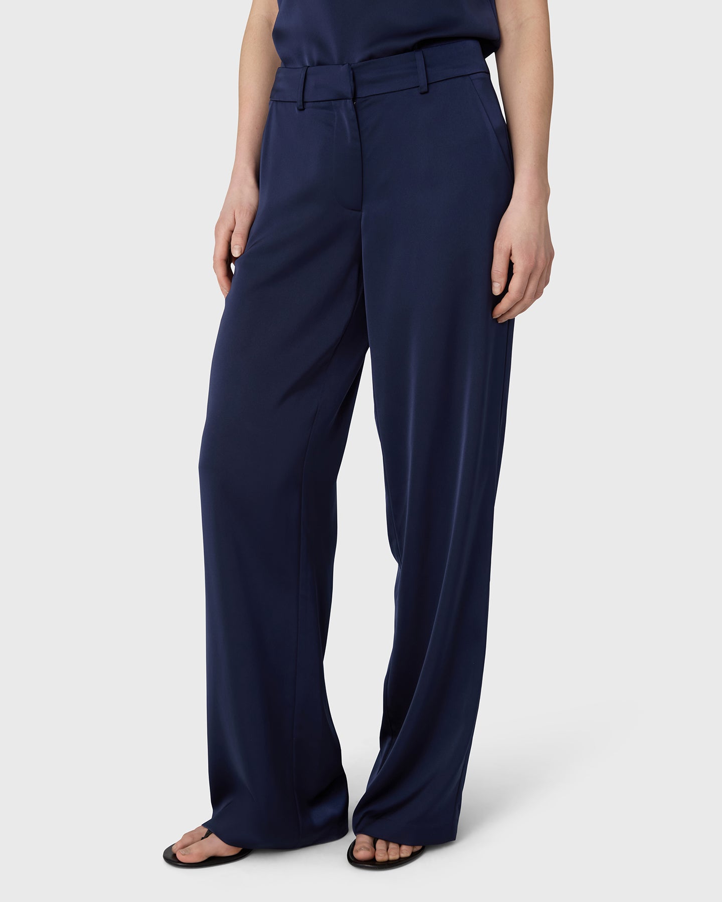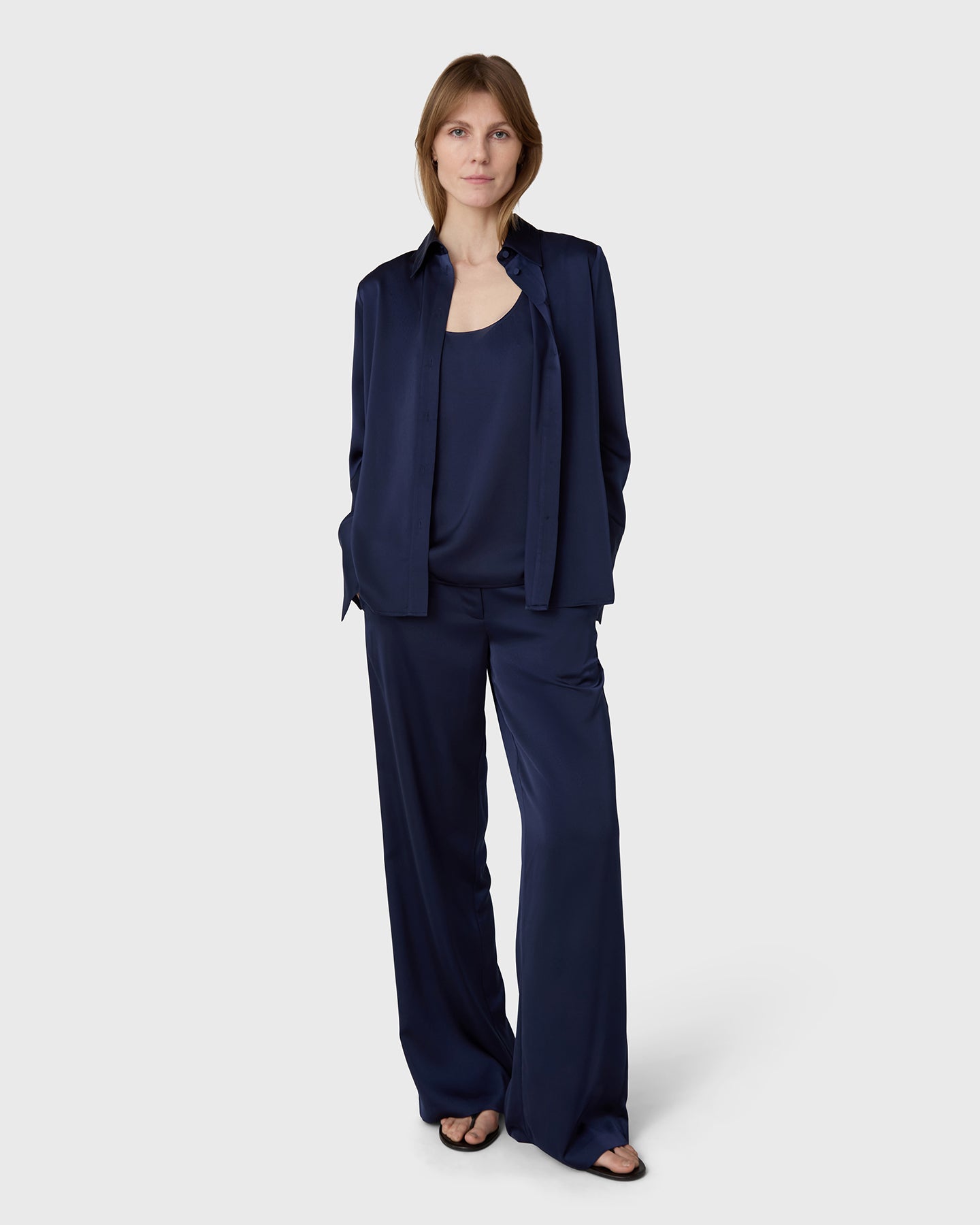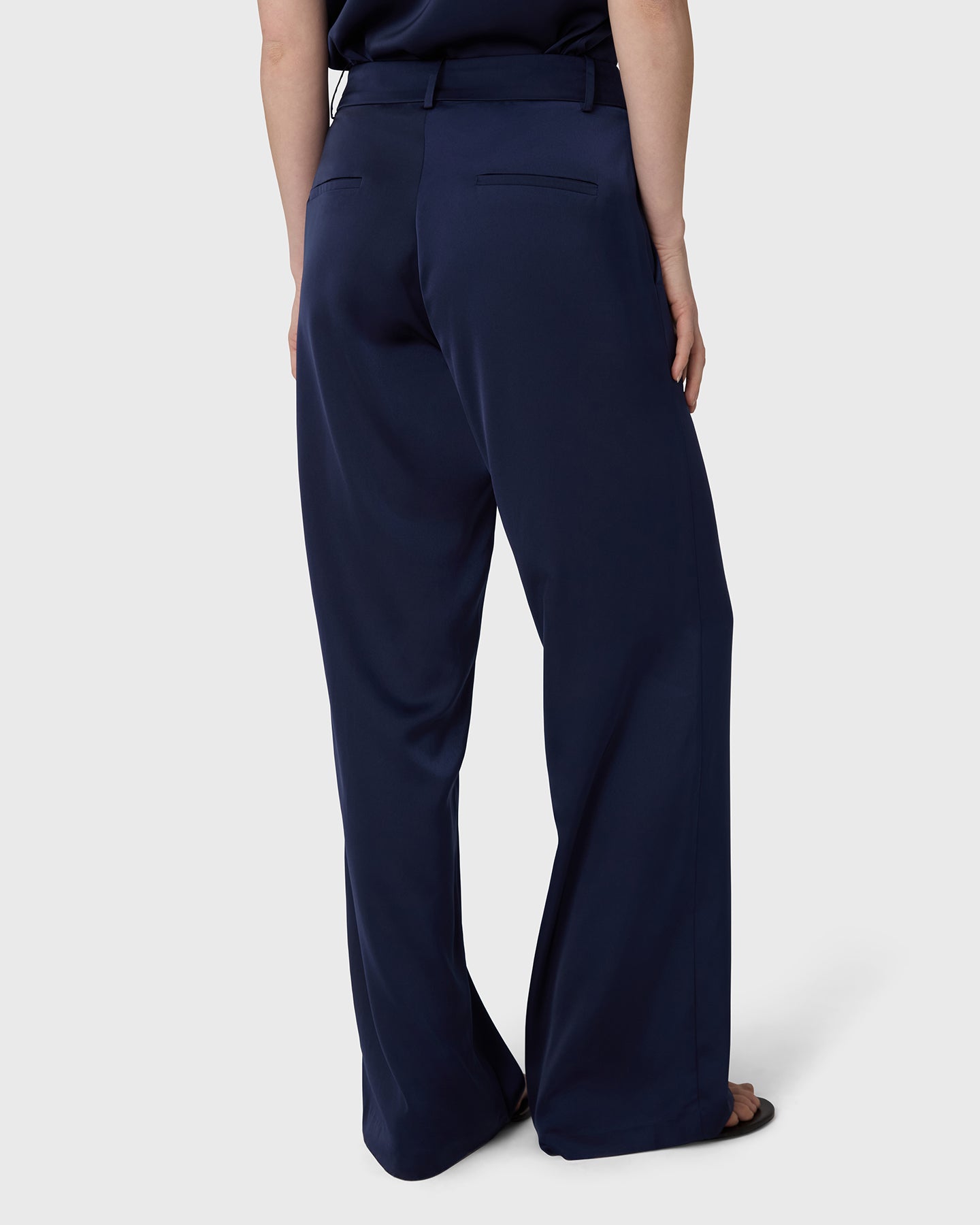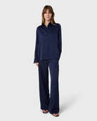 The Ingrid Satin Trousers are cut with wide legs, a mid rise waist and a front zip for a clean silhouette. Satin stretch adds a soft, fluid drape that works equally well in polished and more relaxed settings.