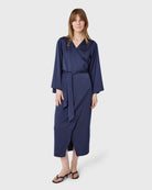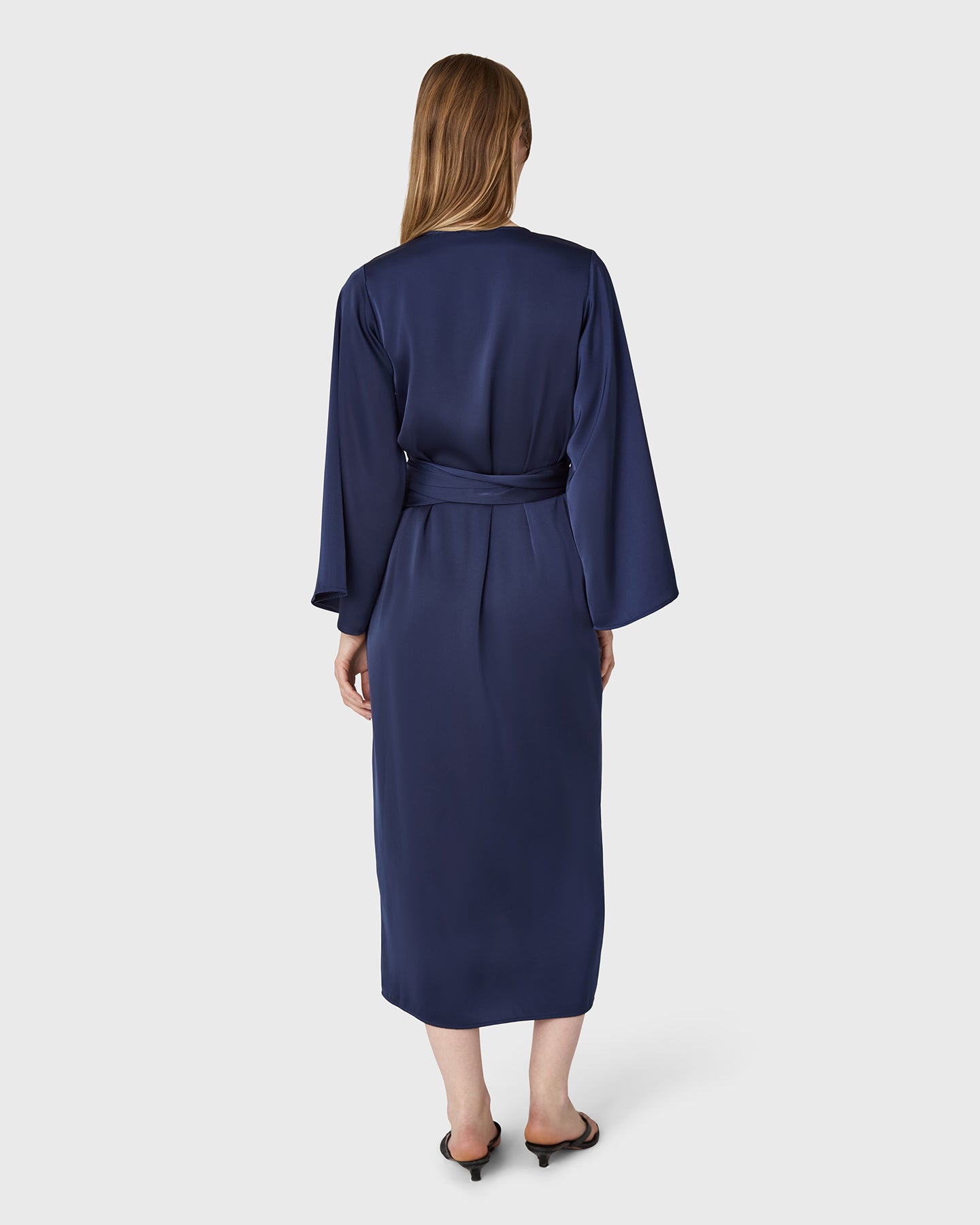 The Mira Dress is our signature wrap style – a timeless piece designed to move and breathe with you. Crafted from soft satin stretch, it drapes beautifully over the body while offering complete ease of wear. The wide sleeves and waist tie create a flattering shape that works as well for the office as it does for evening events. A go-to dress for when you need effortless elegance.
