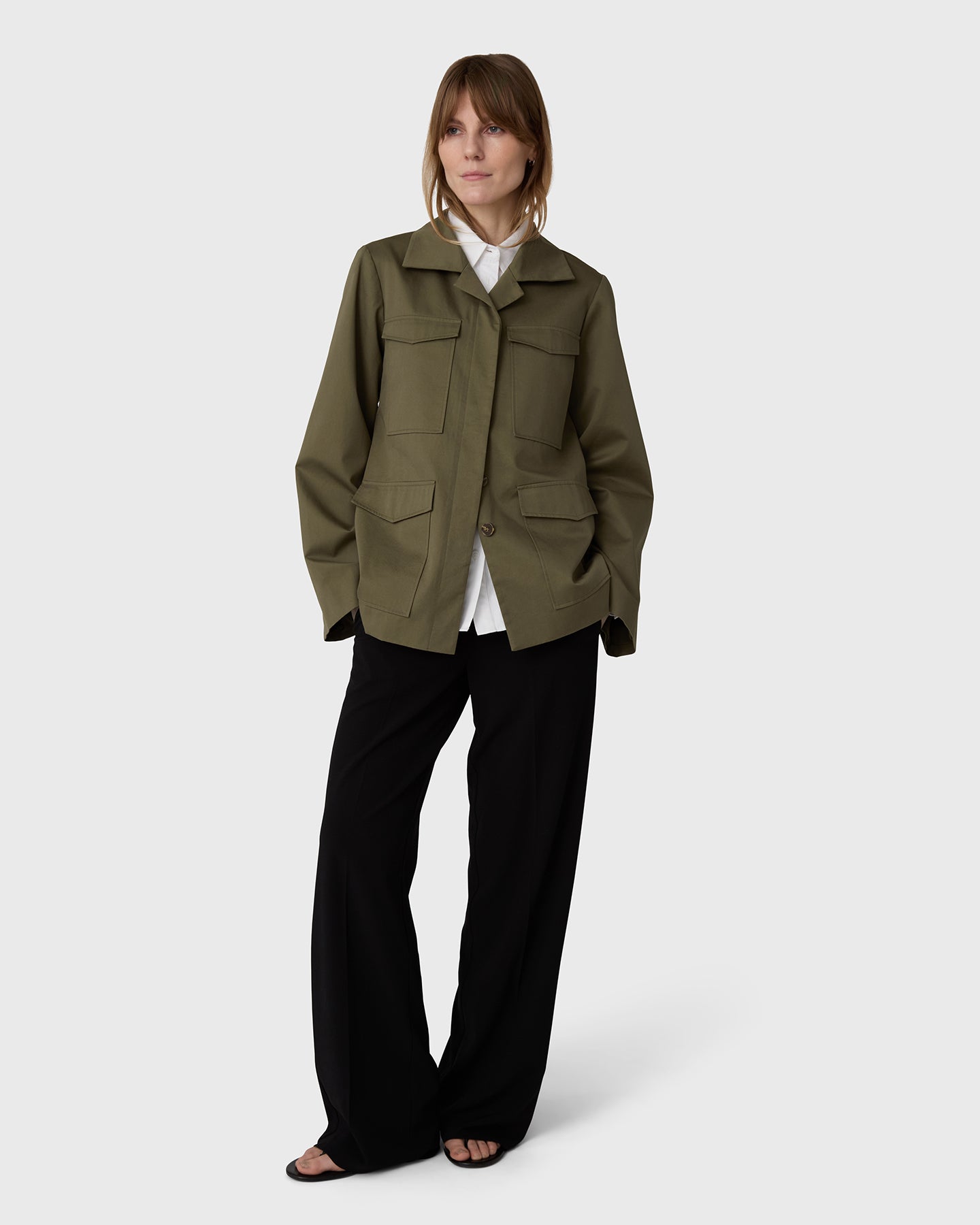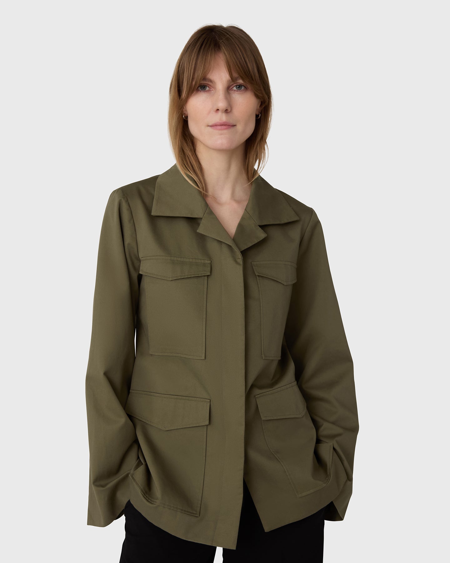 The Riley Cotton Army Jacket is crafted from soft, durable cotton, offering a fitted, slightly longer design with wider sleeves and a clean silhouette. Balancing structure and ease, it is a refined outer layer designed to move effortlessly through your day.