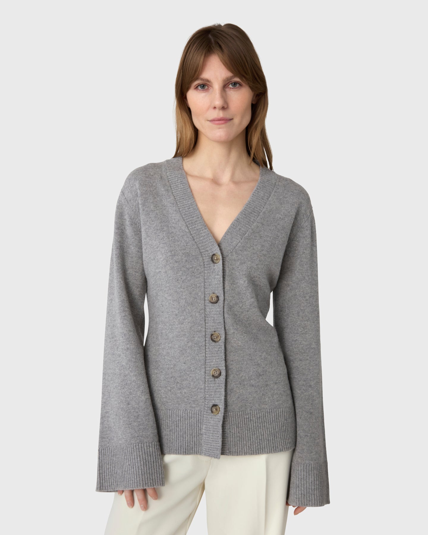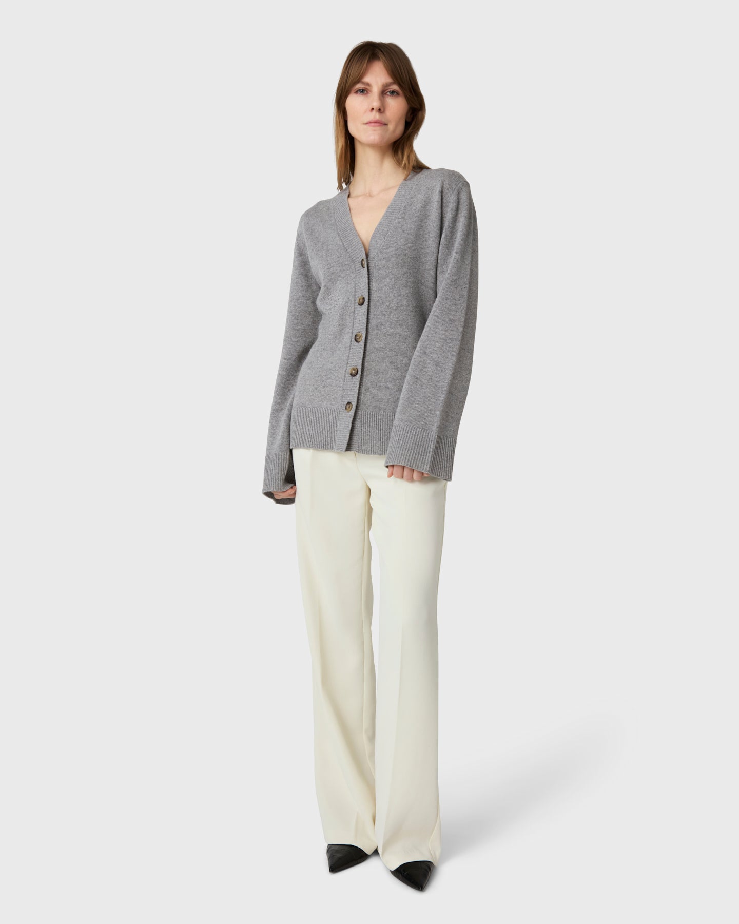 Soft and feminine. The Yara Cardigan is a V-neck cardigan in 100% merino wool, designed with a gently shaped waist, horn buttons and slightly wider sleeves.