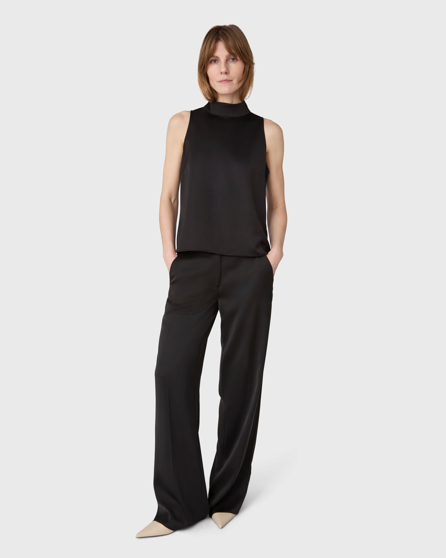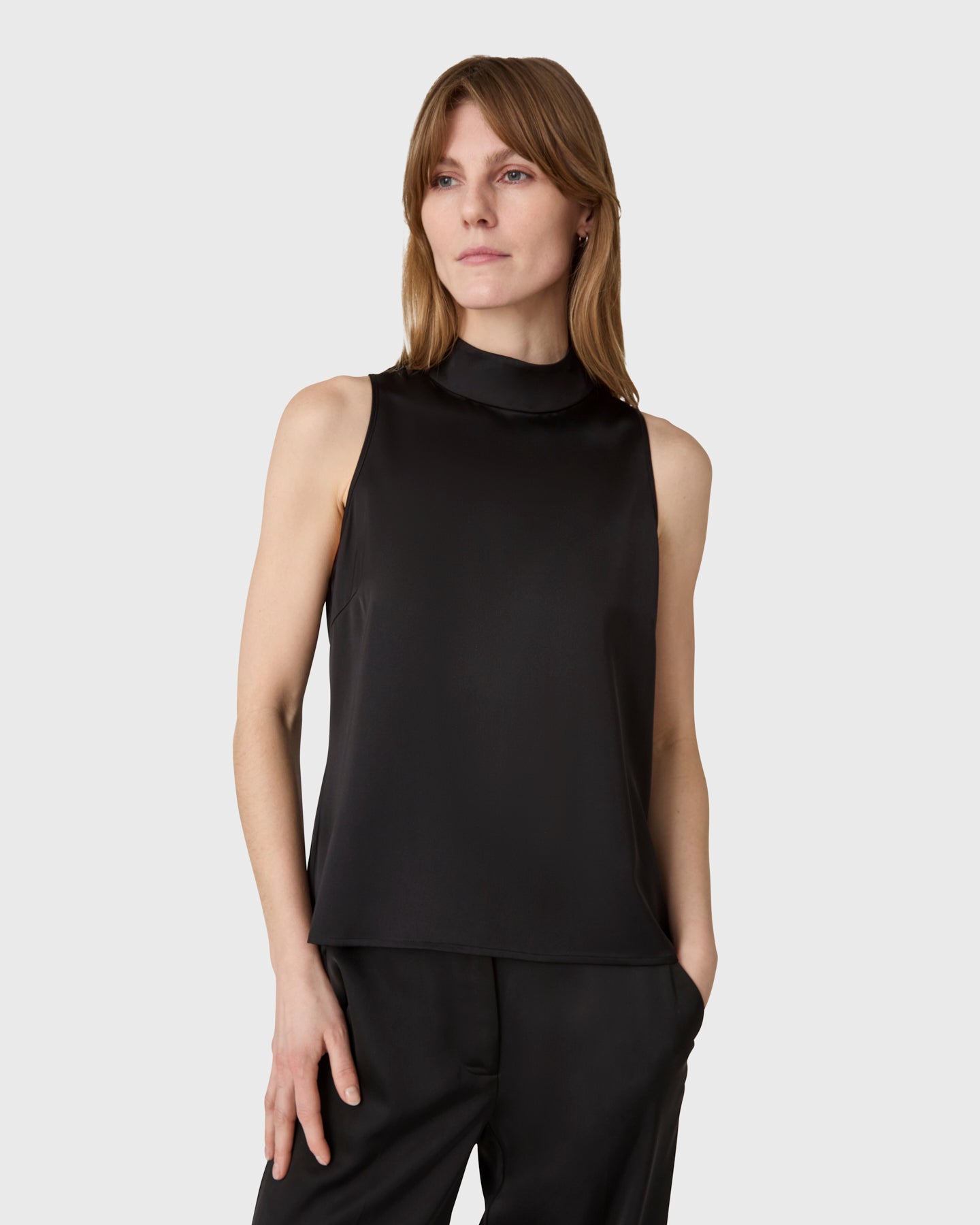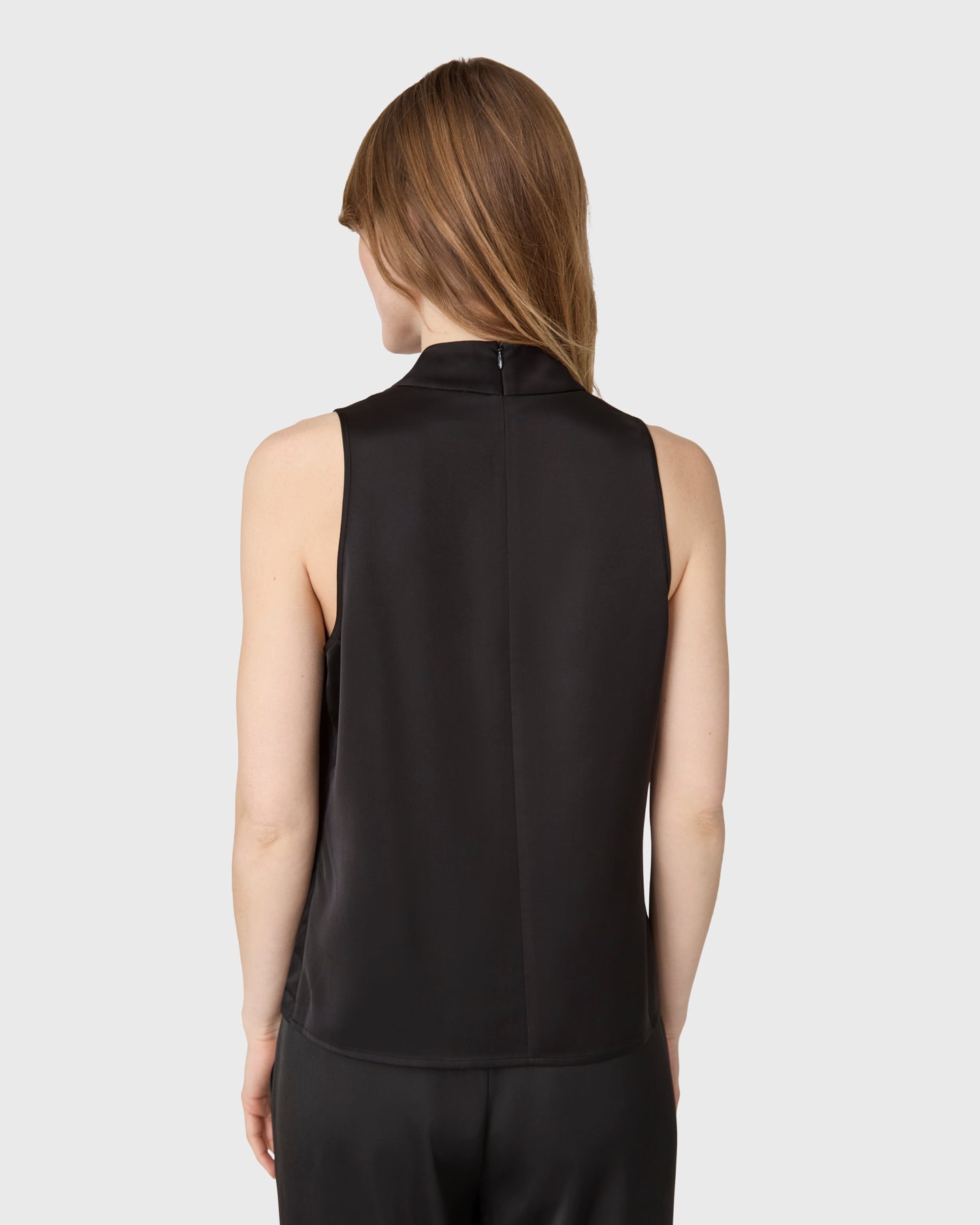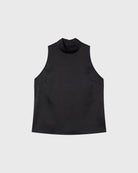 The Zeta Top is a sleeveless halterneck top with a stand-up collar in satin stretch.