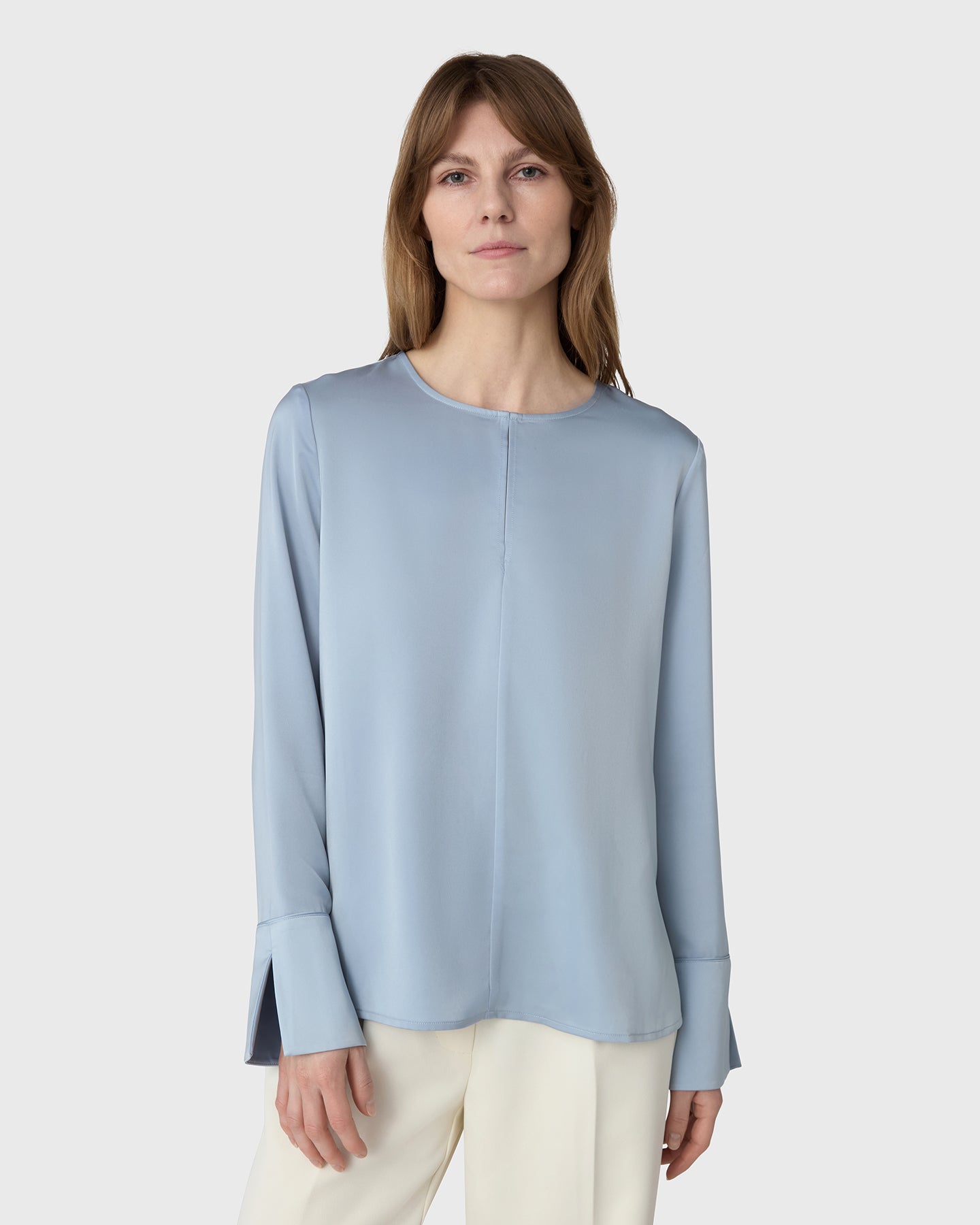 A timeless wardrobe essential with a soft twist. The Angela Blouse is cut from fluid satin stretch and features a rounded neckline with a feminine slit at the front. The subtle cuffs add a tailored finish to the relaxed silhouette, making it ideal for both professional settings and off-duty days. Tuck it into trousers or wear it loose for understated elegance.