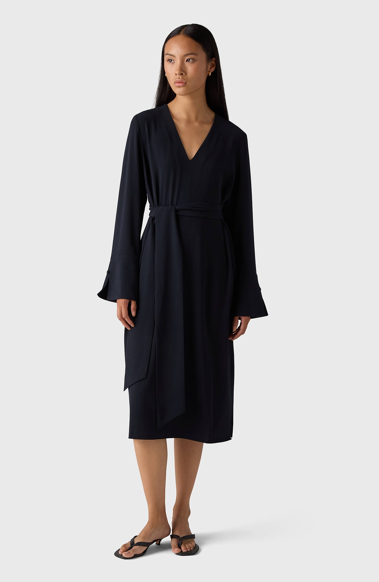 The Kate Dress is a V-necked midi dress that features long sleeves with cuffs and comes complete with an accompanying belt to enhance your silhouette.
