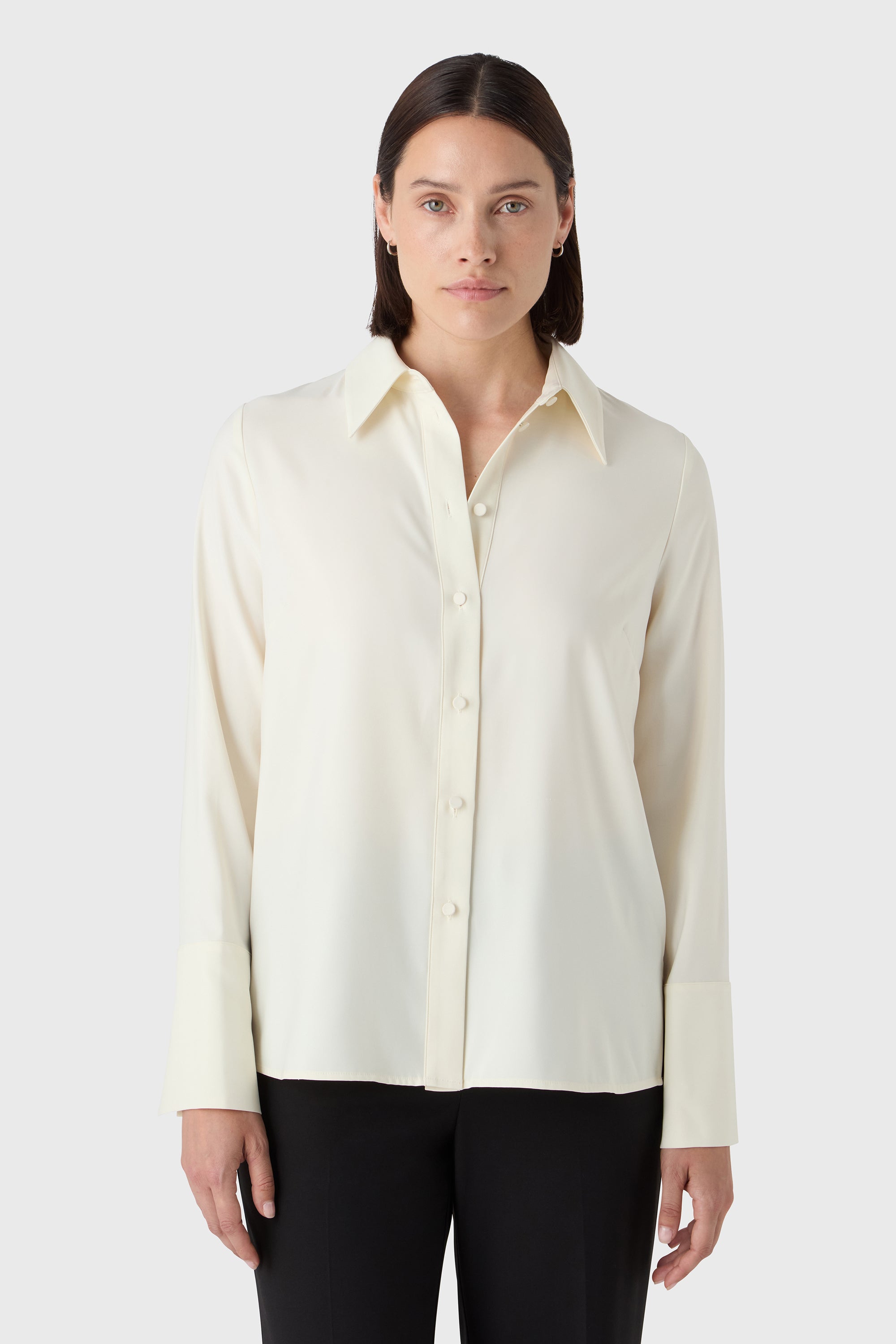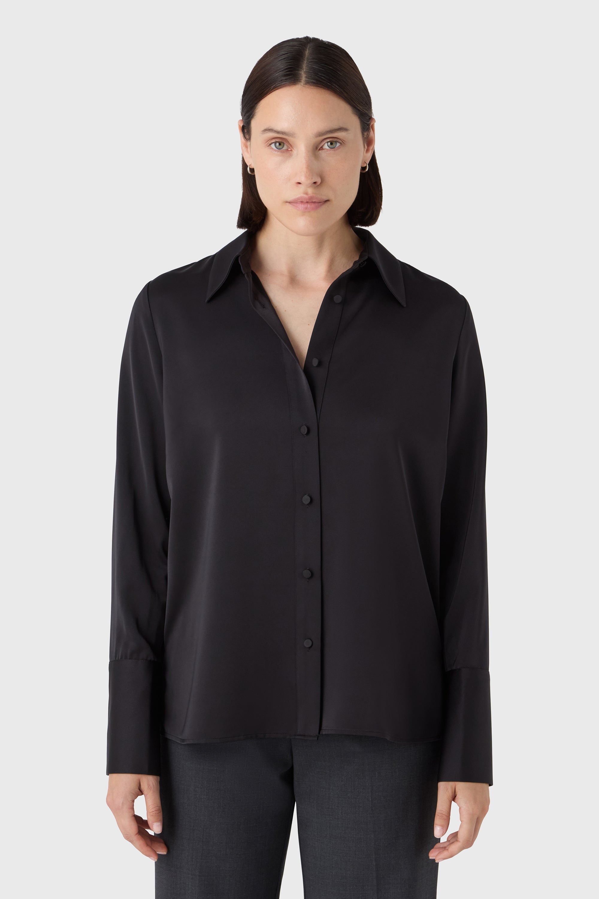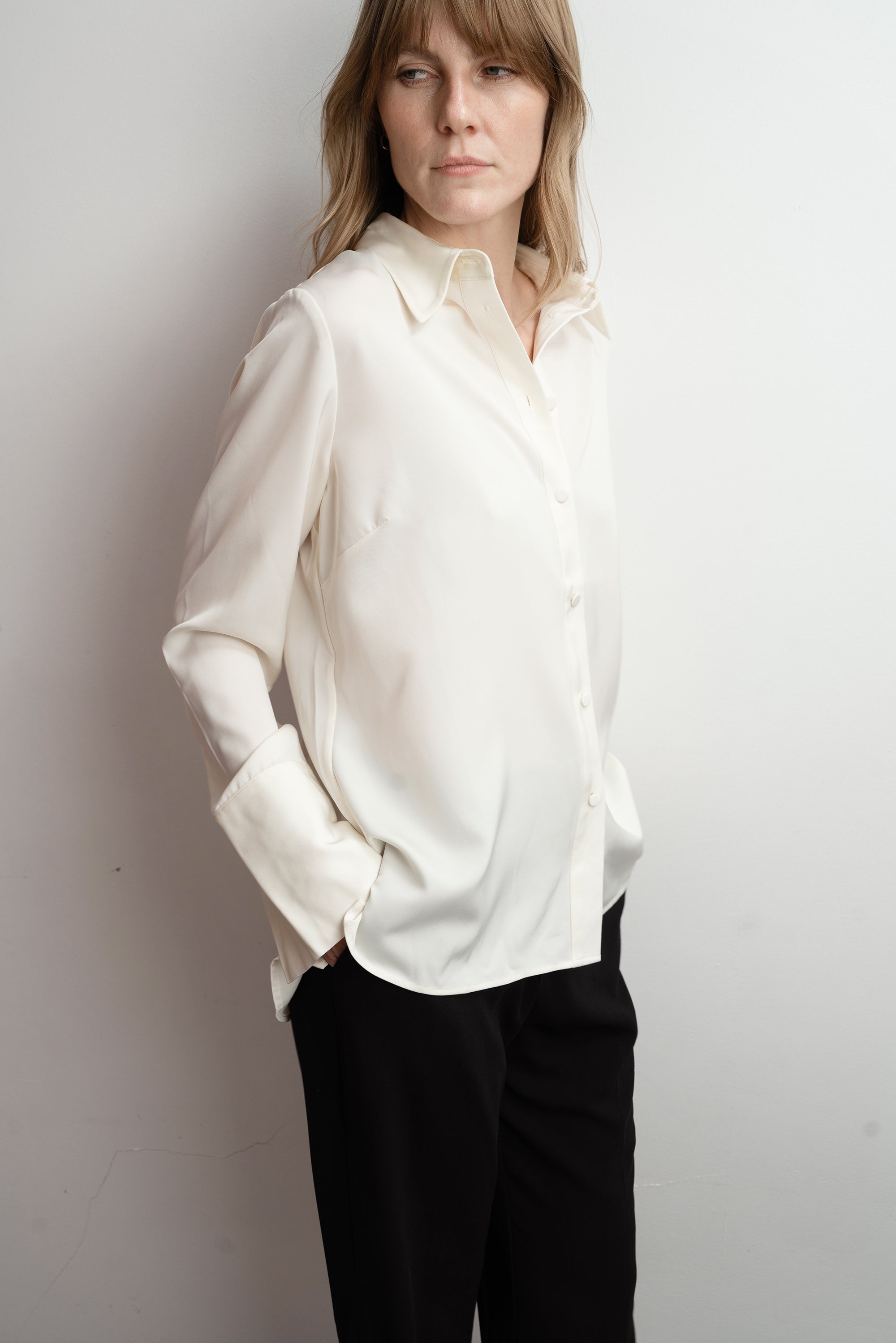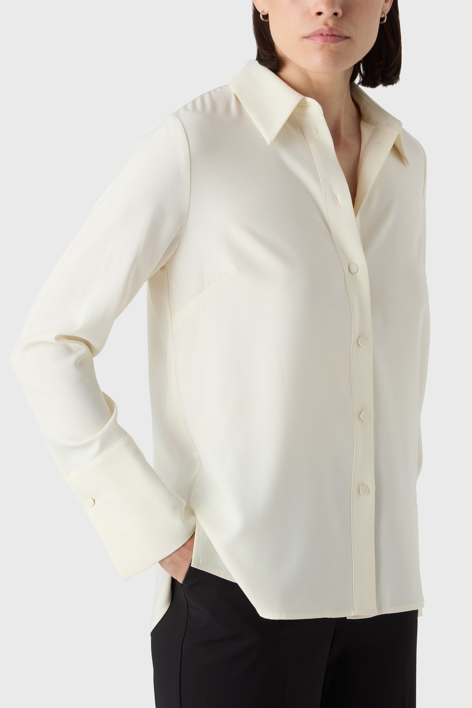 Soft structure with a touch of shine. The Leonie Blouse is a feminine take on the classic shirt — designed in satin stretch with long sleeves, decorative cuffs and fabric-covered buttons. A polished piece that pairs effortlessly with tailored trousers or soft knits.