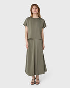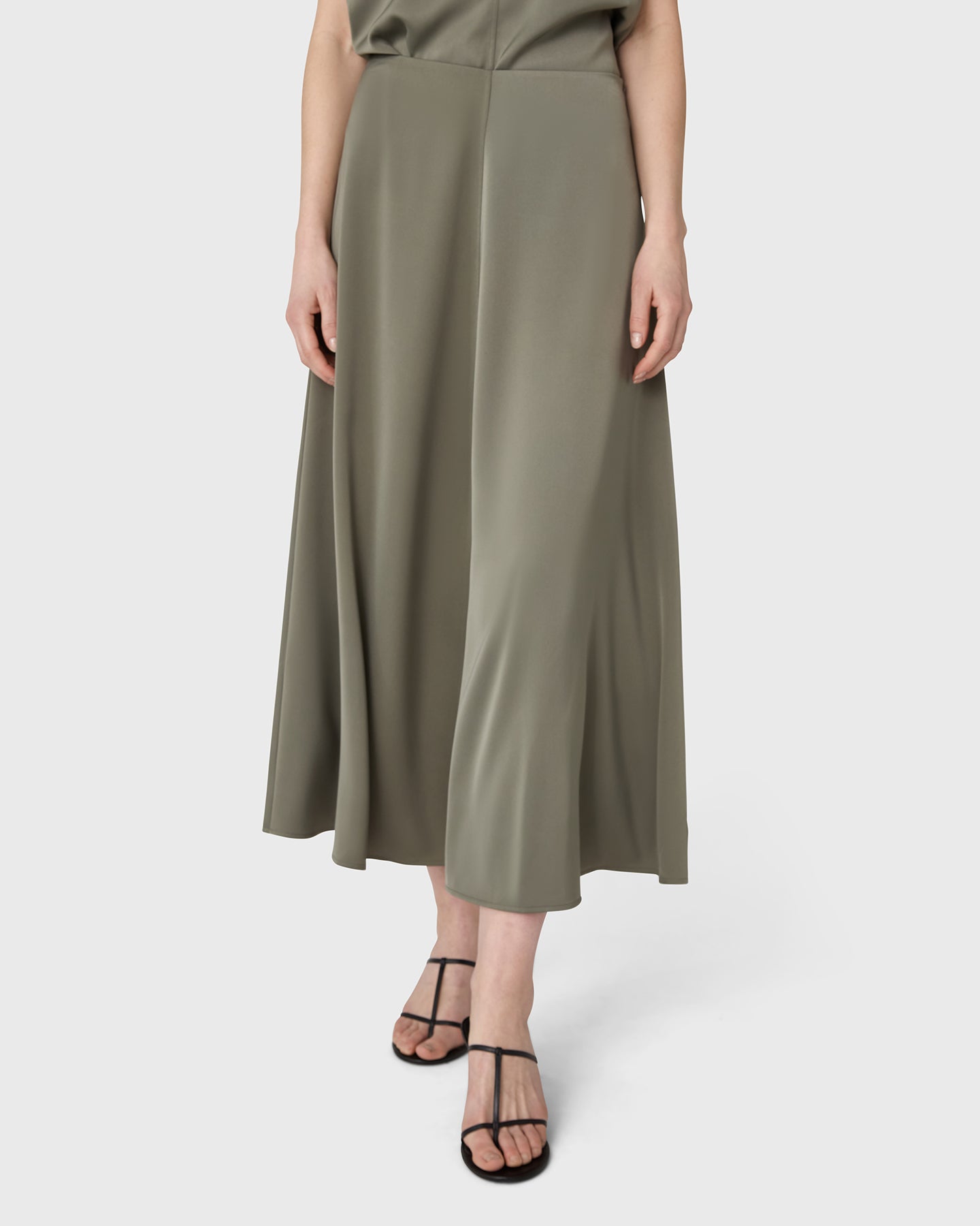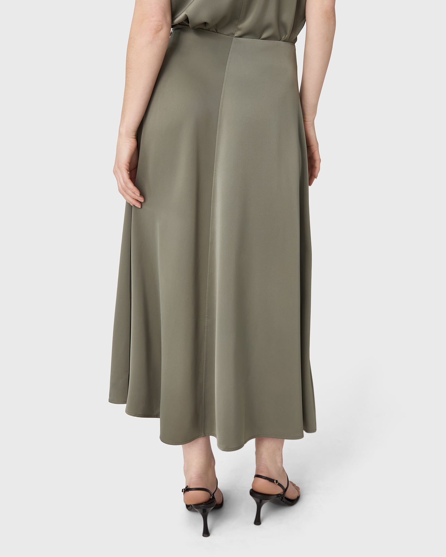 The Rhonda Satin Skirt is an ankle-length skirt in satin stretch with a softly draped silhouette. A subtle front seam adds a clean, refined expression. Pair with the matching Mia Satin Top for a cohesive look, or style with a simple tank for understated ease.