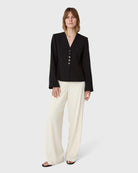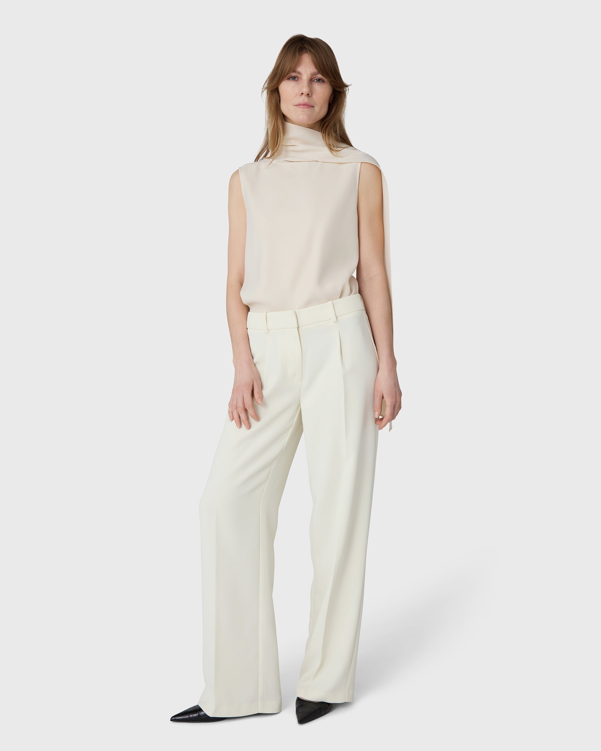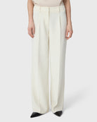 Tidlösa, vida byxor med noggrant placerade frontveck som skapar en ren och balanserad silhuett utan överflödig volym. Tillverkade i vårt signaturmaterial heavy stretch crepe – ett maskintvättbart tyg med vacker tyngd, följsamt fall och naturlig motståndskraft mot skrynklor. Ett par cremefärgade byxor att bära genom säsonger, år efter år.