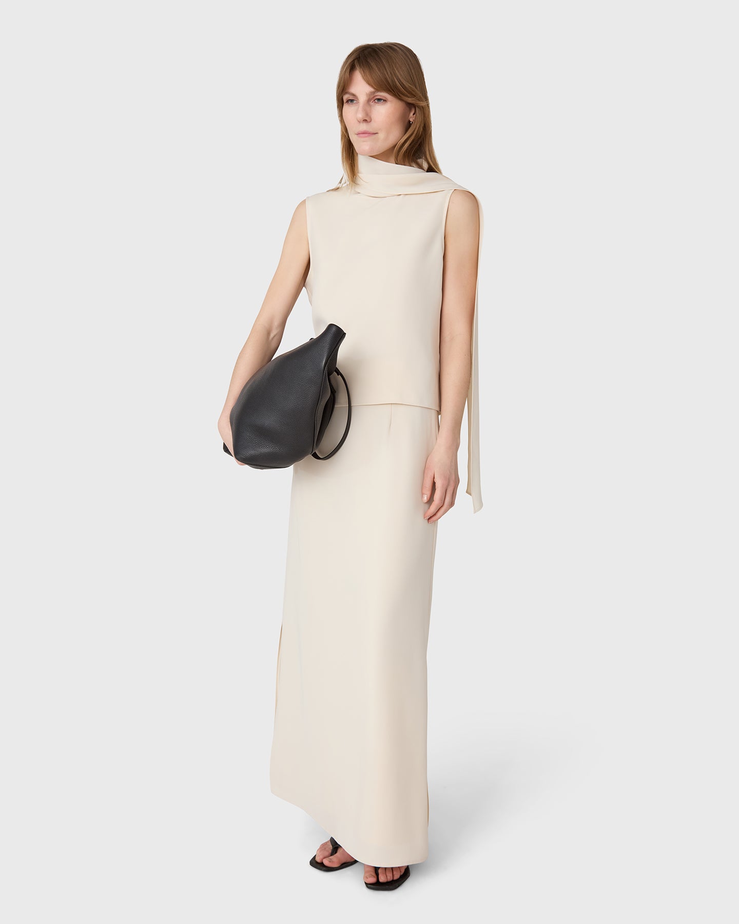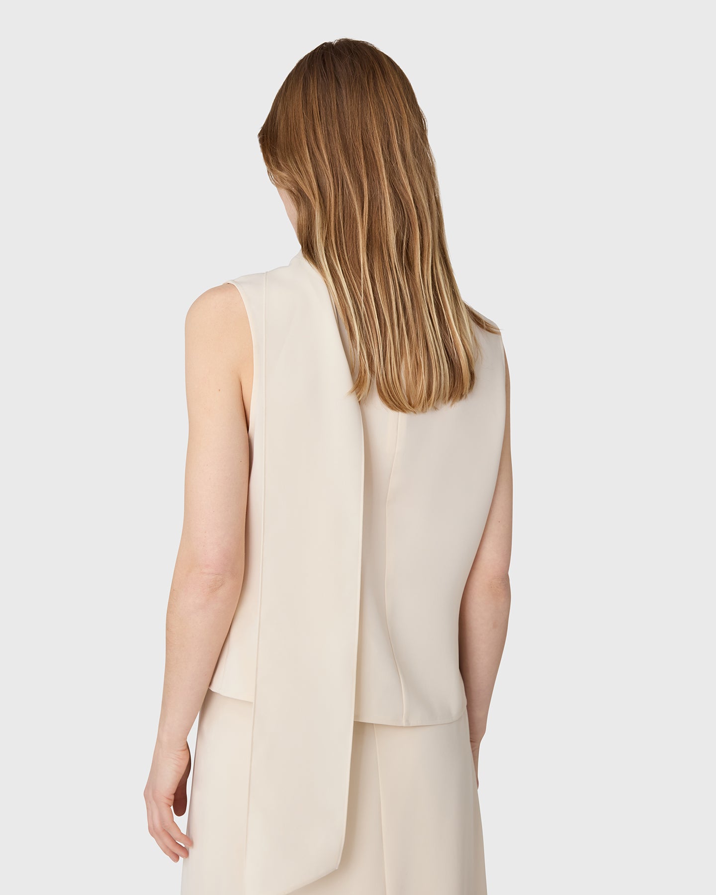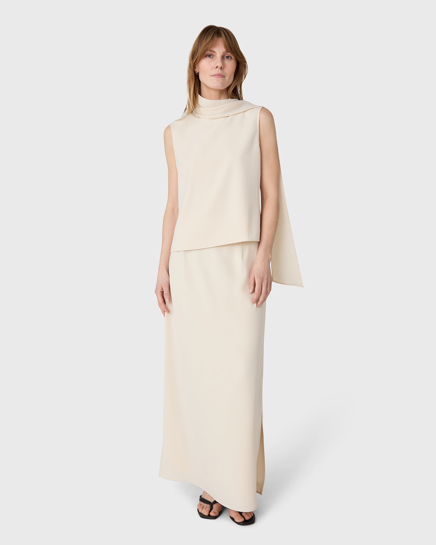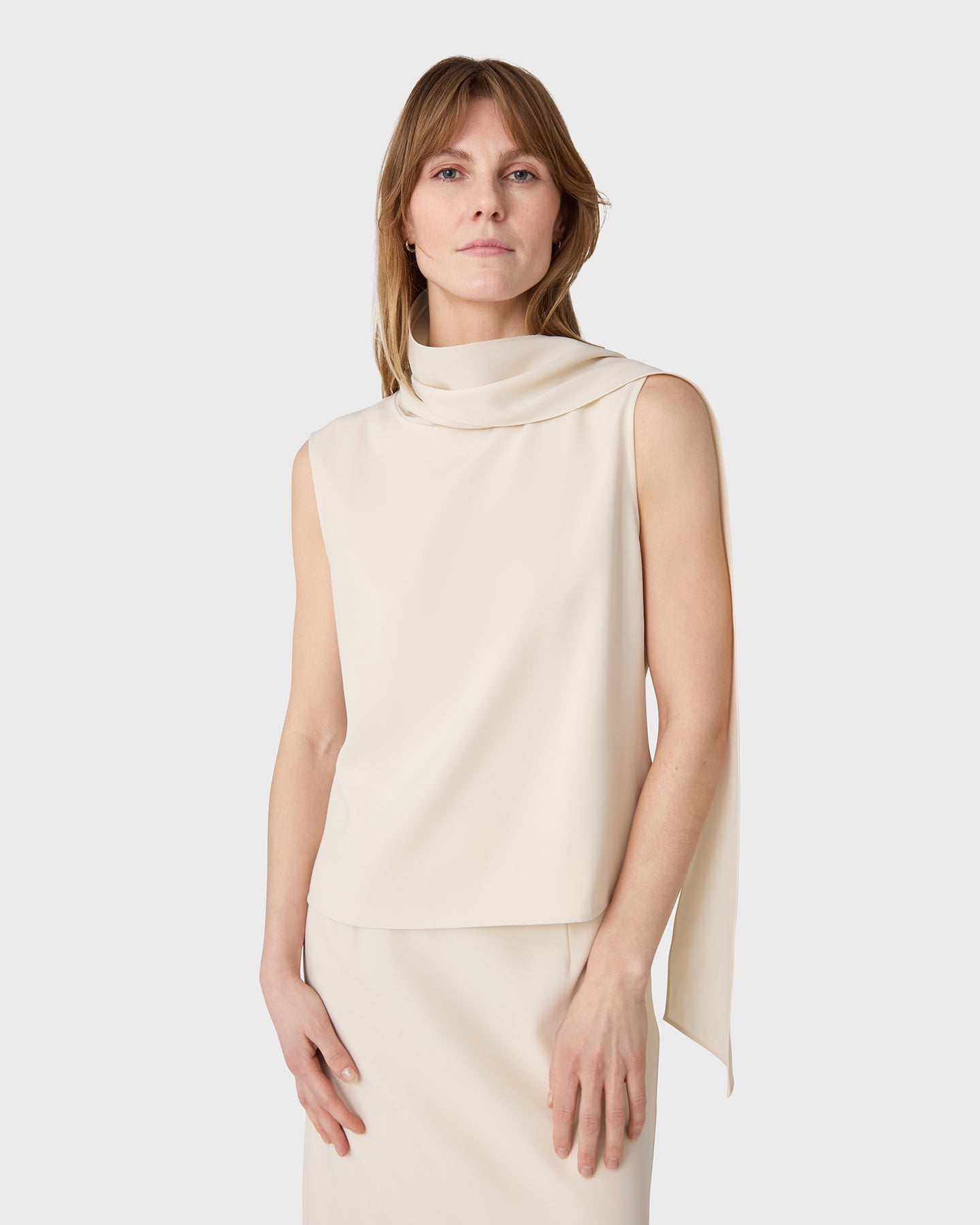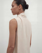 The Orly polotopp är en ärmlös polotröja i twill med en scarfdetalj. Bär den som ett set tillsammans med matchande Marlow Kjol, eller ensam.