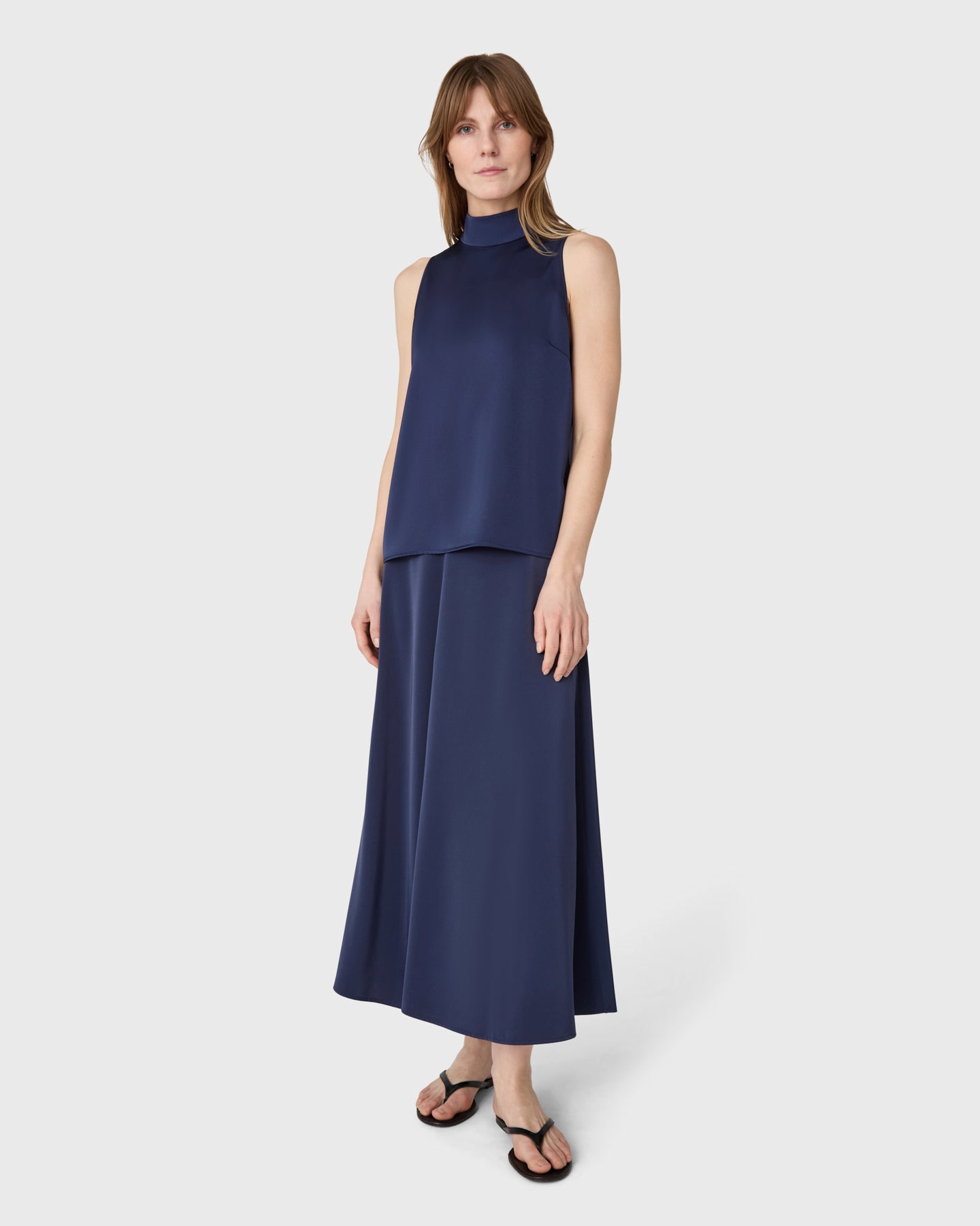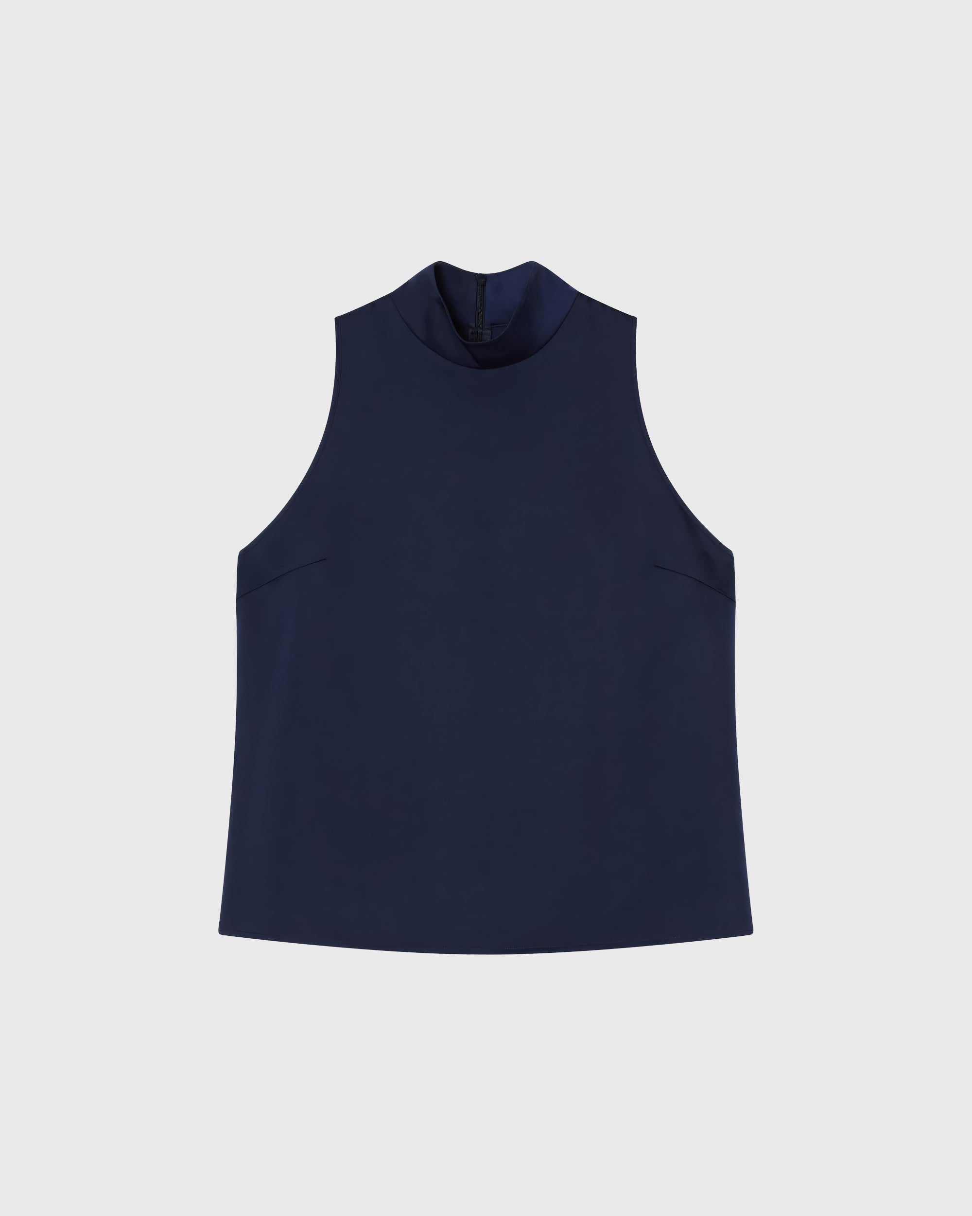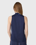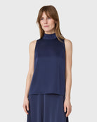The Zeta topp är en ärmlös halternecktopp med ståkrage i satin stretch.